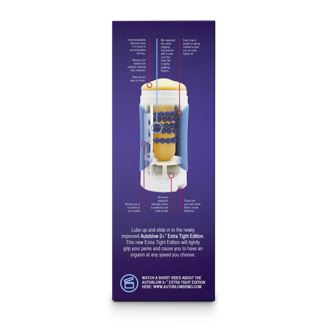 Autoblow 2+ XT består af et robust hylster med et udtageligt sleeve. Sleevet er lavet i et blødt og strækbart materiale, der giver dig en utrolig realistisk fornemmelse. Påfør en smule vandbaseret glidecreme på din bedste ven, og lad så sleevets indbydende mundåbning glide ned over dig. Inden i blowjob-maskinen sidder der hele fem ringe med roterende kugler, der omslutter din penis. Og her gør tilføjelsen XT i navnet sig gældende. XT står nemlig for ’extra tight’, altså ekstra stram, fordi den nye Autoblow er udstyret med en kraftig fjedermekanisme, der sikrer et ekstra stramt greb omkring penisskaftet. Det føles helt rigtigt.