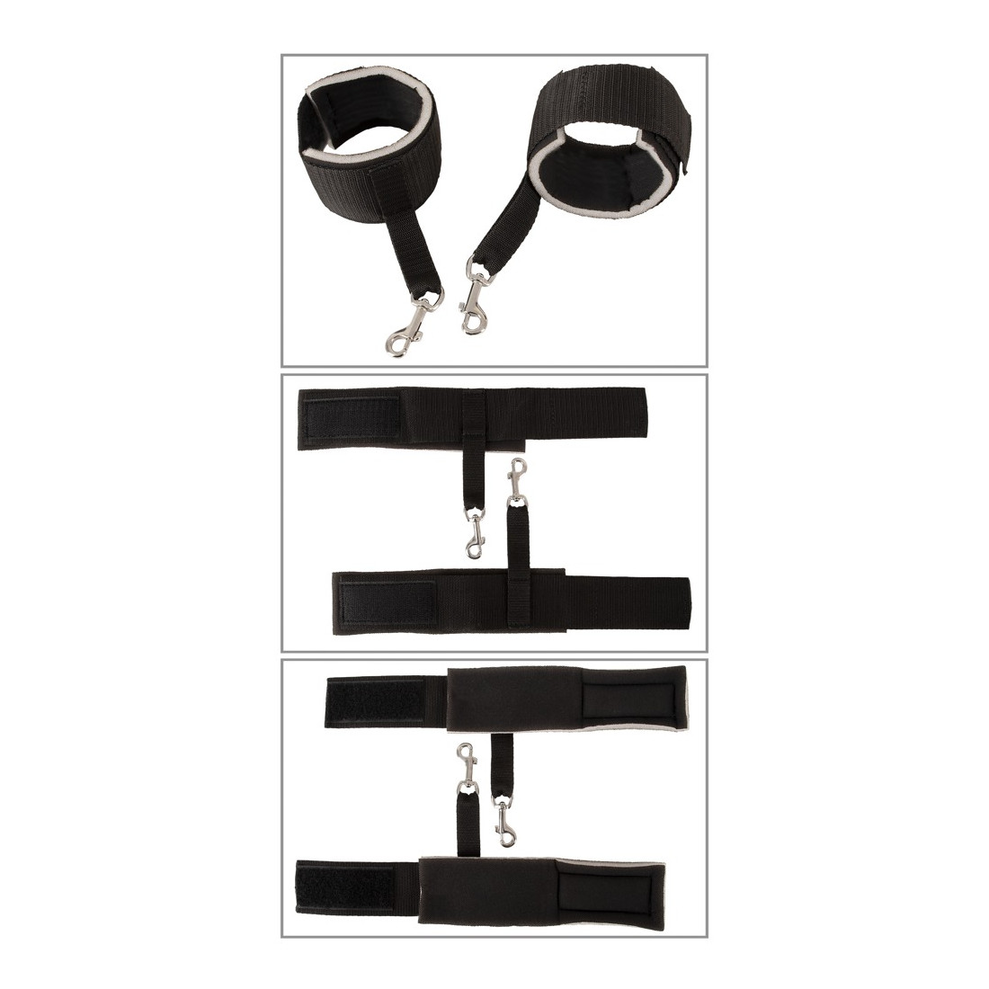 Med dette bondage-sæt medfølger alt, der skal til for at forføre og kontrollere din submissive partner. Tænder I på BDSM-sexleg, vil I elske dette udstyr, som omfatter blandt andet blindfold bidefast mund-gag, robuste kæder med karabinhager, bløde manchetter til hænder og fødder og ikke mindst en stor og blød bondage-kærlighedspude, som er tøndeformet. Manchetterne er hurtige at tage af og på, og så er de behagelige at have på selv i længere tid.