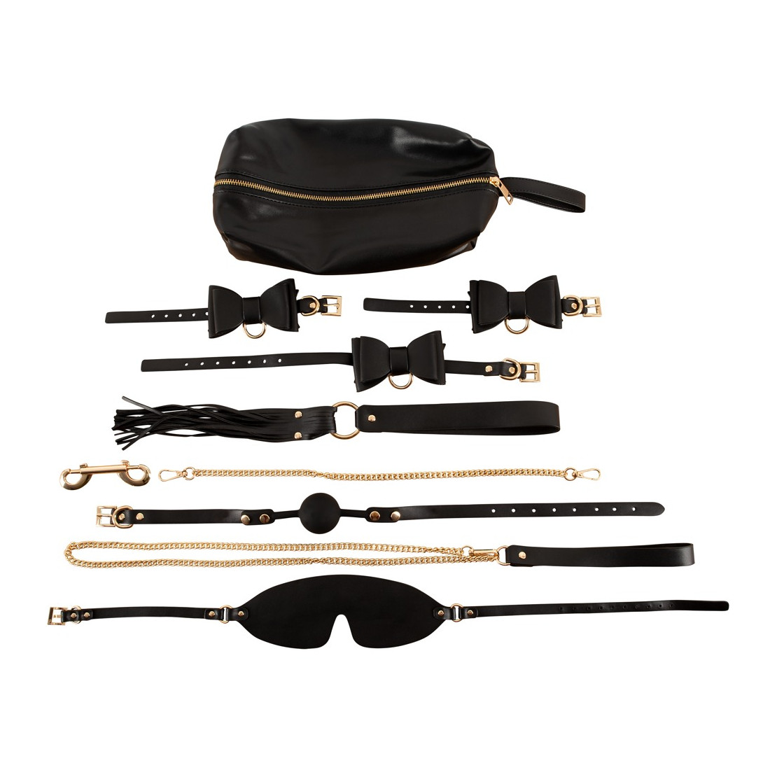 Med Bad Kitty Bondage Sæt I Læderlook med Guldfarve Kæder får du et helt sæt lavet i det fineste imiterede læder med ekstravagante sløjfedekorationer som en fin og uskyldig detalje. Med de mange forskellige dele har du udstyret til en rigtig sjov aften med din partner.