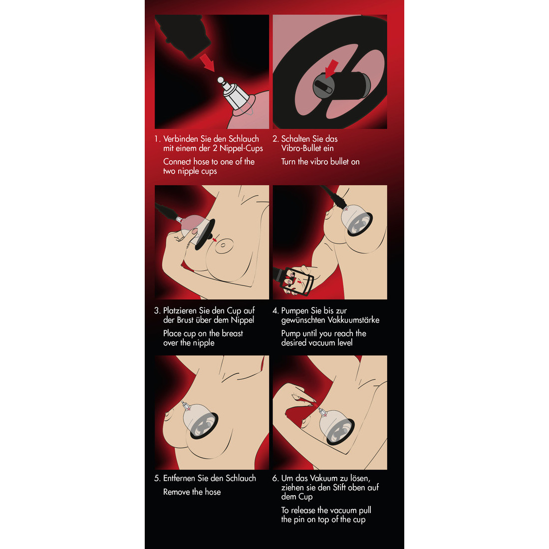 Anvendelsen af pumpesættet er meget enkel: Isæt vibratoræggene og tænd, hvis du ønsker ekstra stimulering. Forbind håndpumpen med den ene sugekop, sæt denne på den ene brystvorte, og begynd at pumpe. Så snart der er dannet et vakuum i sugekoppen, sidder den fast af sig selv. Du kan nu fjerne pumpen og gentage proceduren på den anden side. Nu kan du nyde håndfri stimulering af brystvorterne, mens du forkæler dig selv eller har sex med din partner. Når du fjerner sugekopperne, vil dine opsvulmede brystvorter tilmed være yderst følsomme, og selv den mindste berøring vil føles meget mere intens.