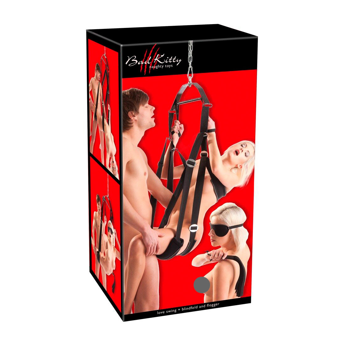 Har du en fræk date, men mangler det helt rigtige udstyr til at gøre jeres aften helt uforglemmelig og utrolig lækker? Så er denne Bad Kitty Love Swing Elskovsgynge oplagt! Sammen med sexgyngen får du nemlig et blindfold og en sort pisk, som lynhurtigt kan forvandle legen til noget nyt og spændende!
