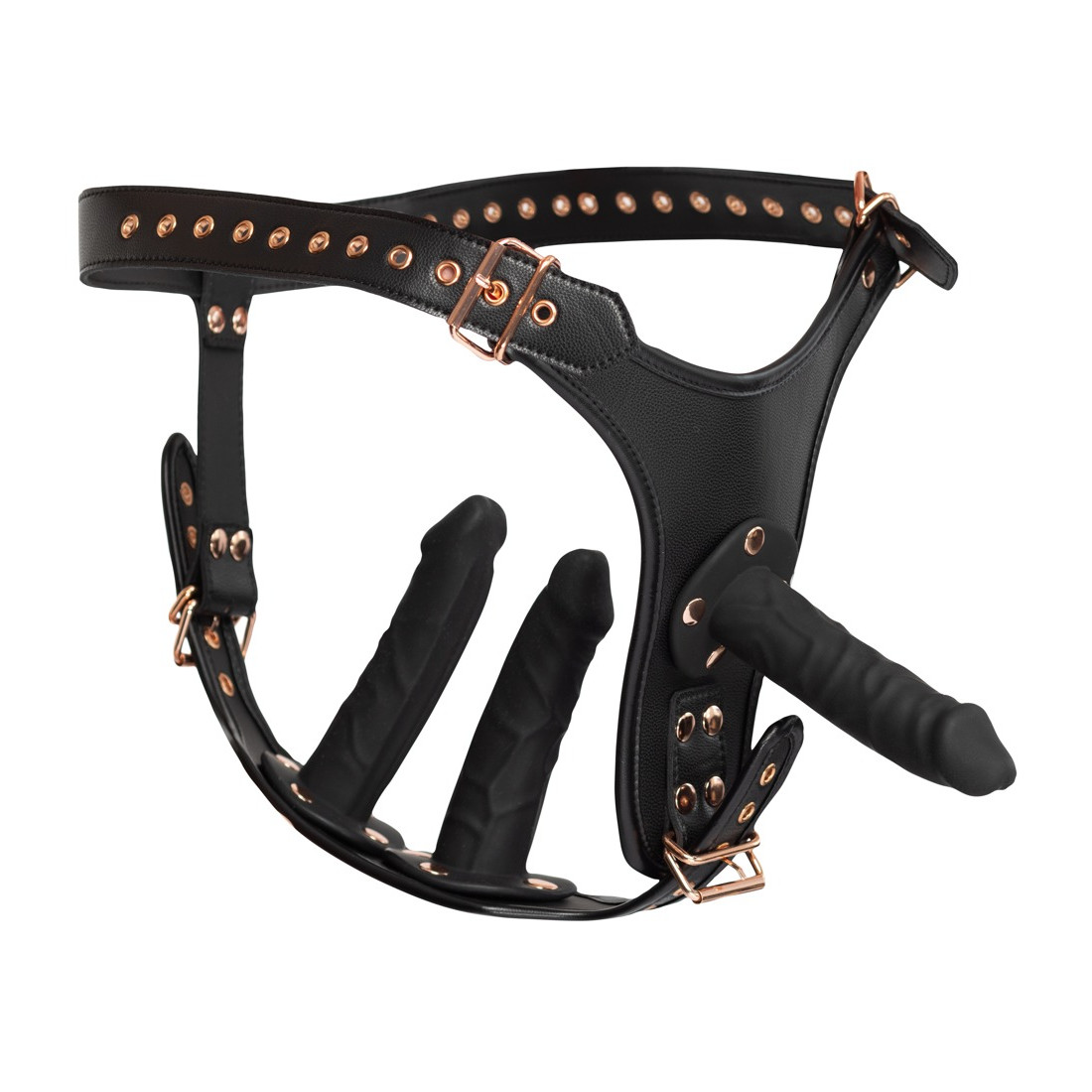 Bad Kitty Strap-on Trusse med 3 Silikone Dildoer er en strap-on med tre dildoer – én til at støde med og to til at give bæreren dobbelt penetration både vaginalt og analt. Som bæreren har du mulighed for at justere remmen i siden og i skridtet med flere spændelukninger, så du får den perfekte pasform. Strap-on’ens remme og bløde imiterede læder vil føles behagelige – selv under den vildeste elskov.