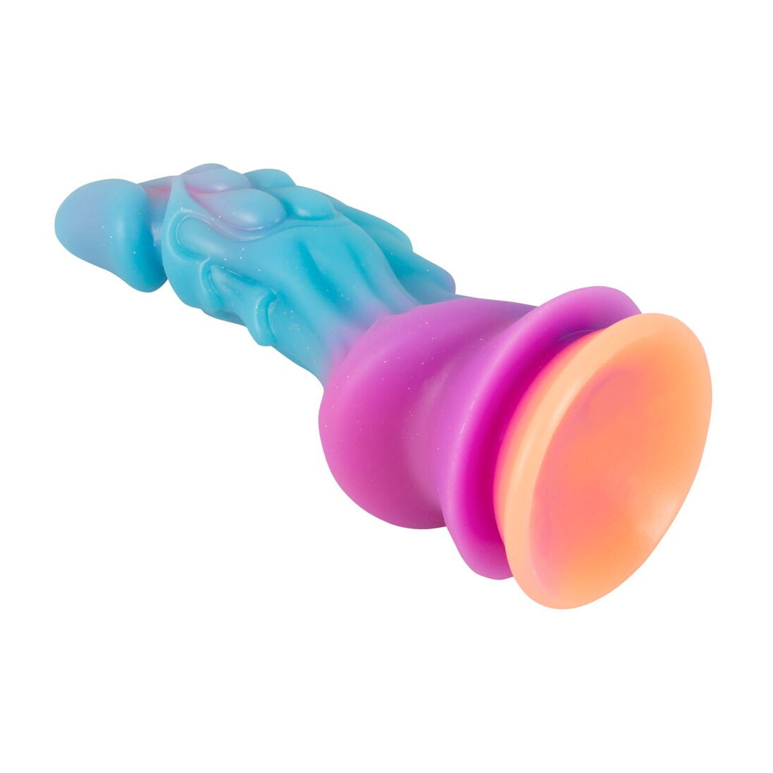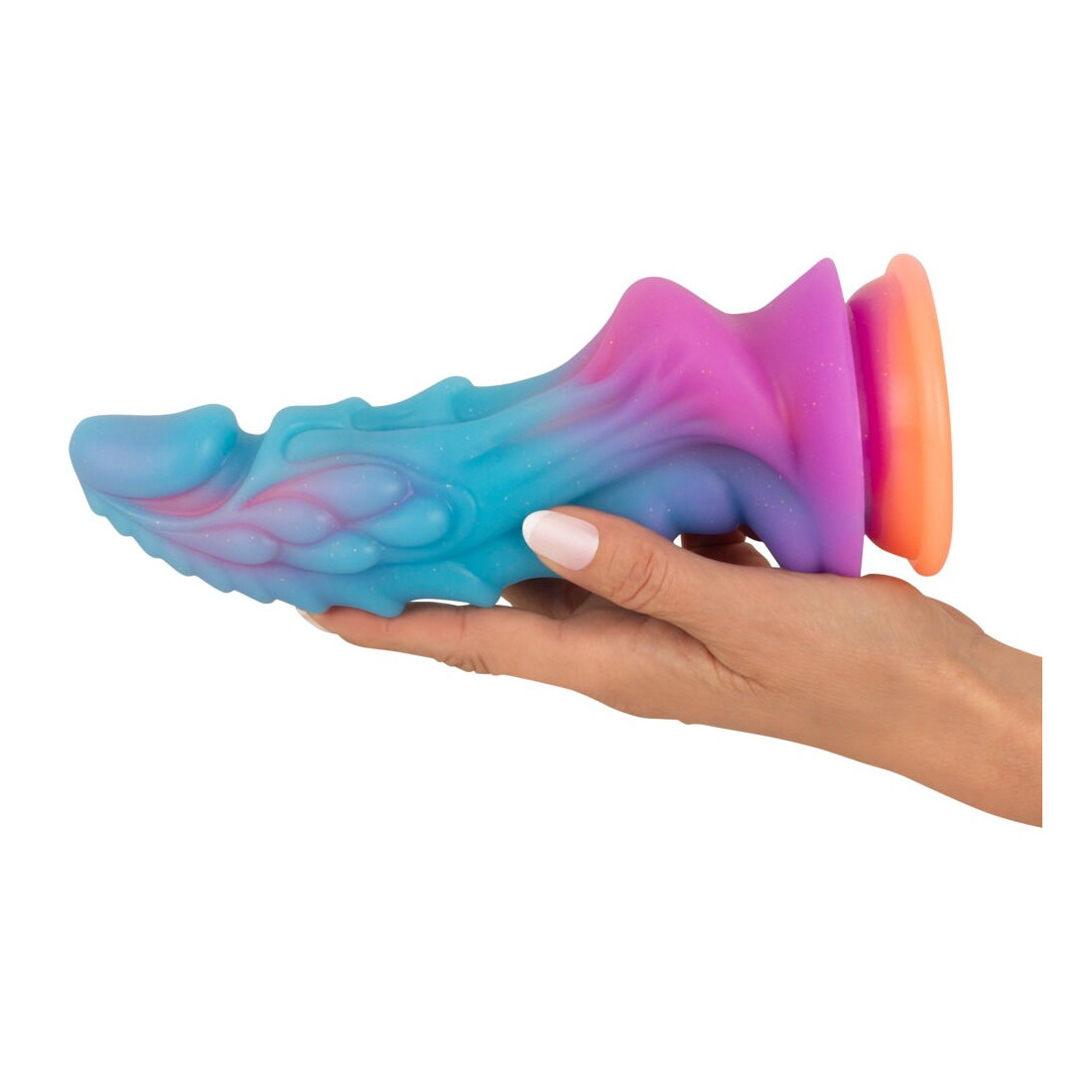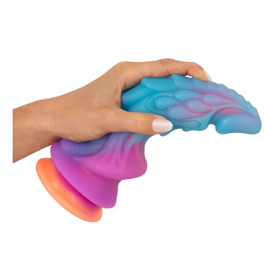 Især de lyserøde, blå og orange glimmerfarver gør denne dildo helt magisk at se på. Og effekten af den er da også den rene magi! Måske kommer du endda til at tro på fabeldyr og drager, efter du har leget med denne store glimmersag. Prikken over i’et er uden tvivl, at dildoen samtidig lyser i mørket! En spændende og superfræk detalje, som gør det endnu sjovere at lege.