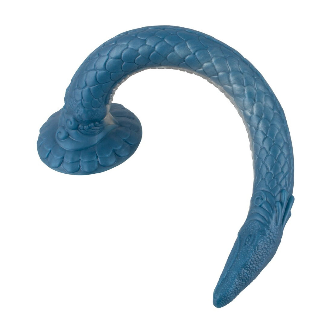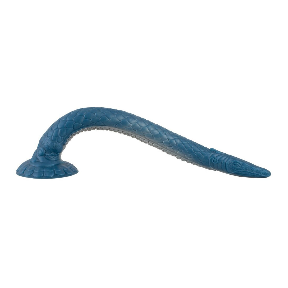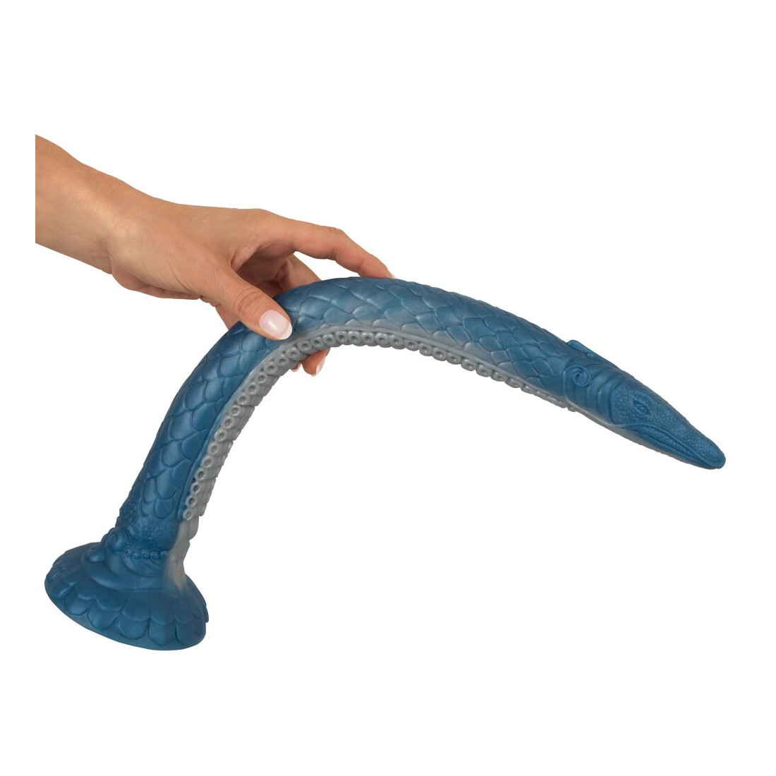 Der er virkelig ikke sparet på detaljerne på denne dildo. Alene de blålige og changerende farvenuancer får dig til at tabe kæben. Skæl, krummelurer, et smalt hoved med øjne og en sugekoplignende underside kan give dig associationer til enten gysere eller eventyrfilm. Og apropos sugekop: Denne enorme dildo er naturligvis udstyret med en kraftig sugekop, så du kan lege med din nye ven på et utal af måder. Sæt den både fast til gulv, stole, borde eller vægge for håndfri sjov.