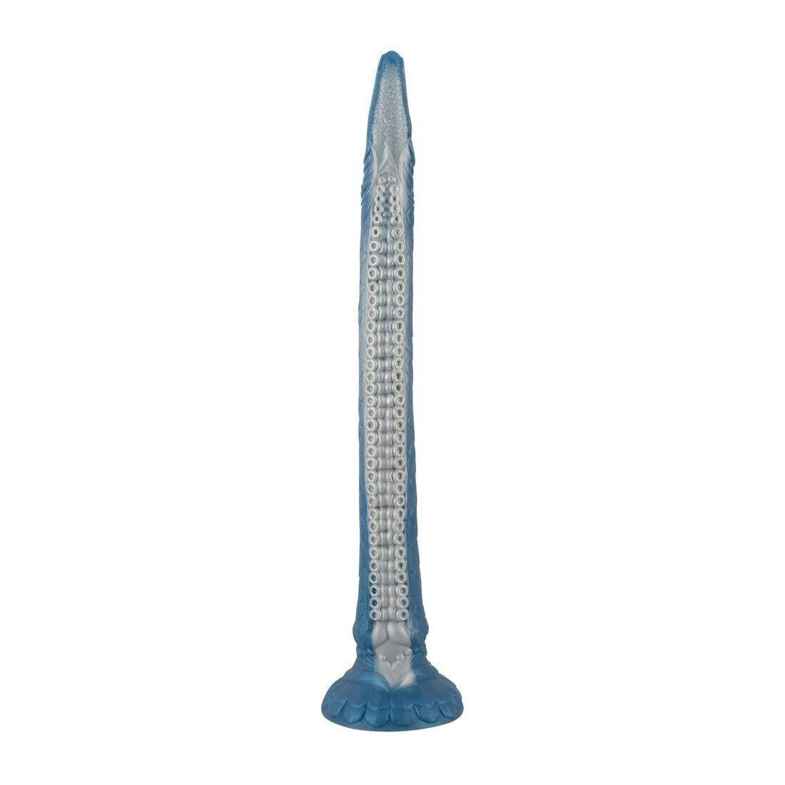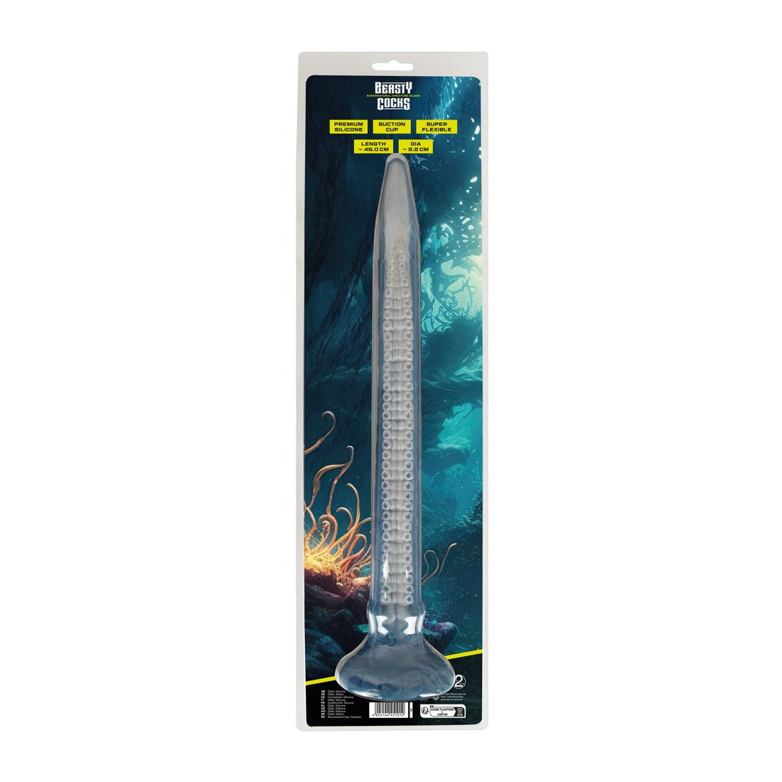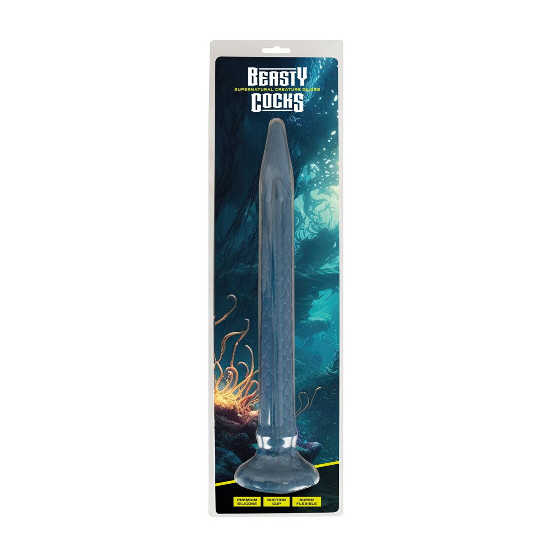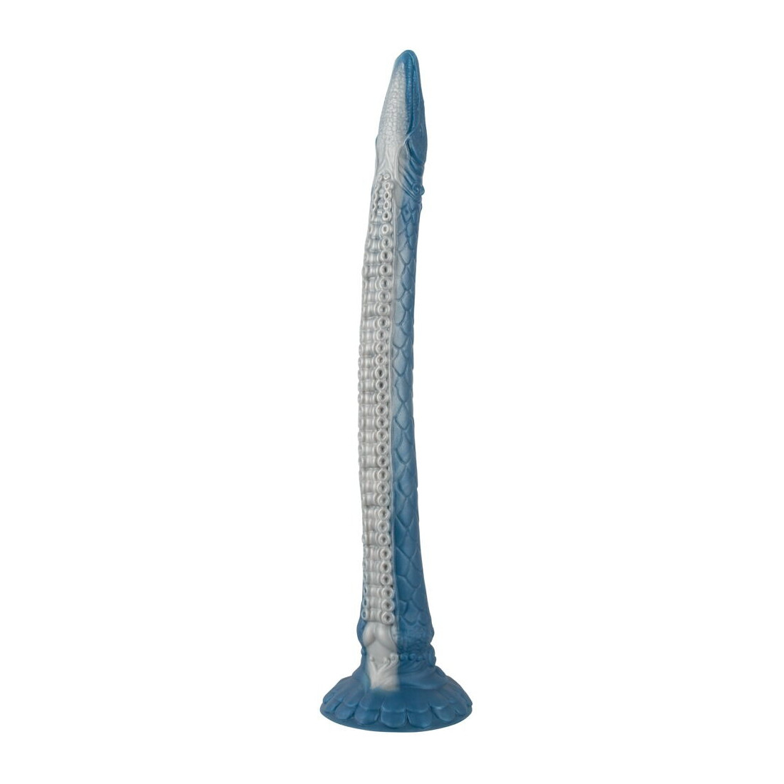 Der er virkelig ikke sparet på detaljerne på denne dildo. Alene de blålige og changerende farvenuancer får dig til at tabe kæben. Skæl, krummelurer, et smalt hoved med øjne og en sugekoplignende underside kan give dig associationer til enten gysere eller eventyrfilm. Og apropos sugekop: Denne enorme dildo er naturligvis udstyret med en kraftig sugekop, så du kan lege med din nye ven på et utal af måder. Sæt den både fast til gulv, stole, borde eller vægge for håndfri sjov.