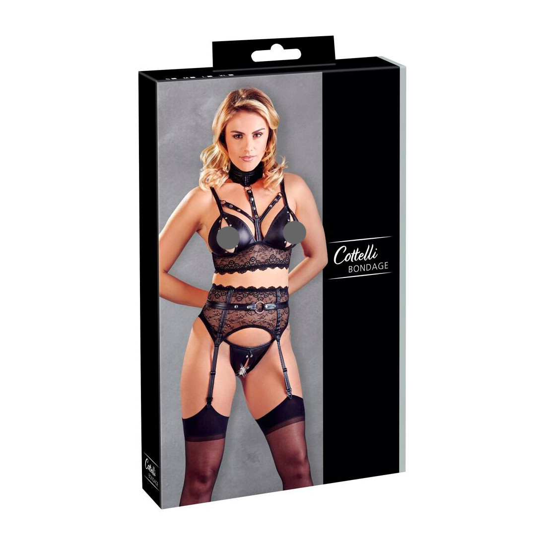 Uanset om du søger det næste lingerisæt til dig selv eller din partner, vil du elske udtrykket fra Cottelli Bondage Hofteholder Sæt med Knapper og Håndledsmanchetter. Du får både BH, hofteholder, trusser og håndledsmanchetter, der kombinerer elegante blonder med nitter og et læderlignende og mat materiale. Du får altså det bedste fra begge verdener med dette tredelte lingerisæt, der er helt unikt og sexet.