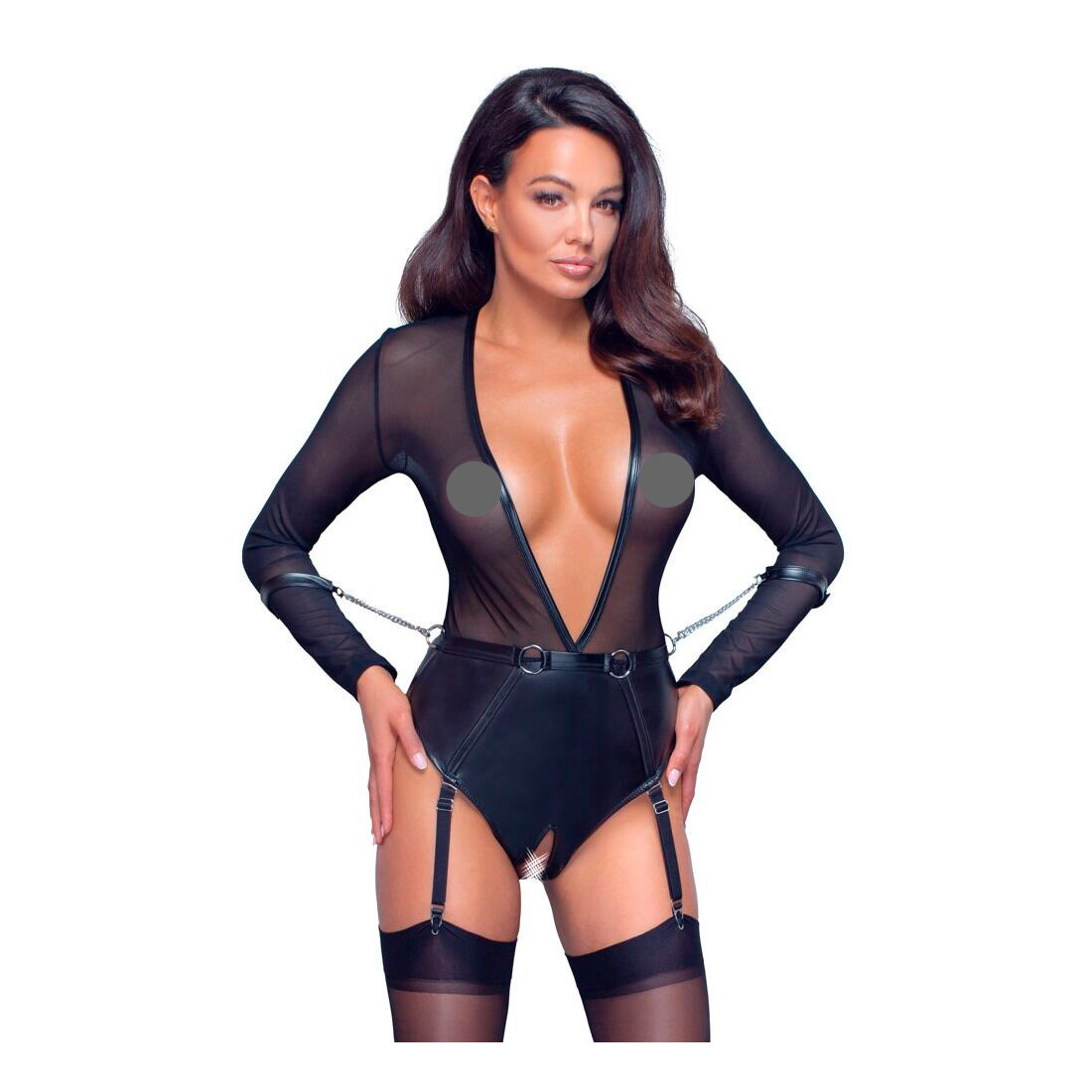 Naturligvis er skridtet åbent, så der altid er en mulighed for at give efter de lyster, der kan opstå. Derudover er denne bodystocking designet med et lækkert bæltestykke, hvorpå to to karabinkæder kan fastgøres. På den måde kan dragten lynhurtigt forvandles til en ideel dominans-legedragt, hvor du er fastspændt af de medfølgende håndjern. Disse kan justeres med velcrolukninger. Body’en afsluttes med frække strømpebånd, som gør det muligt for dig at fuldende looket med sexede strømper (købes separat).