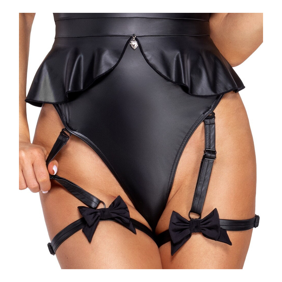 De fine sløjfer ved strømperemmene giver looket en sød kontrast til resten af det mørke, glatte materiale, og fordi stropperne både kan justeres og tages helt af, kan du selv bestemme, hvor klassisk eller dristigt dit outfit skal være. Det bløde, elastiske materiale følger kroppen, uanset om du bevæger dig langsomt og sensuelt eller lader dig rive med i et mere legende tempo.