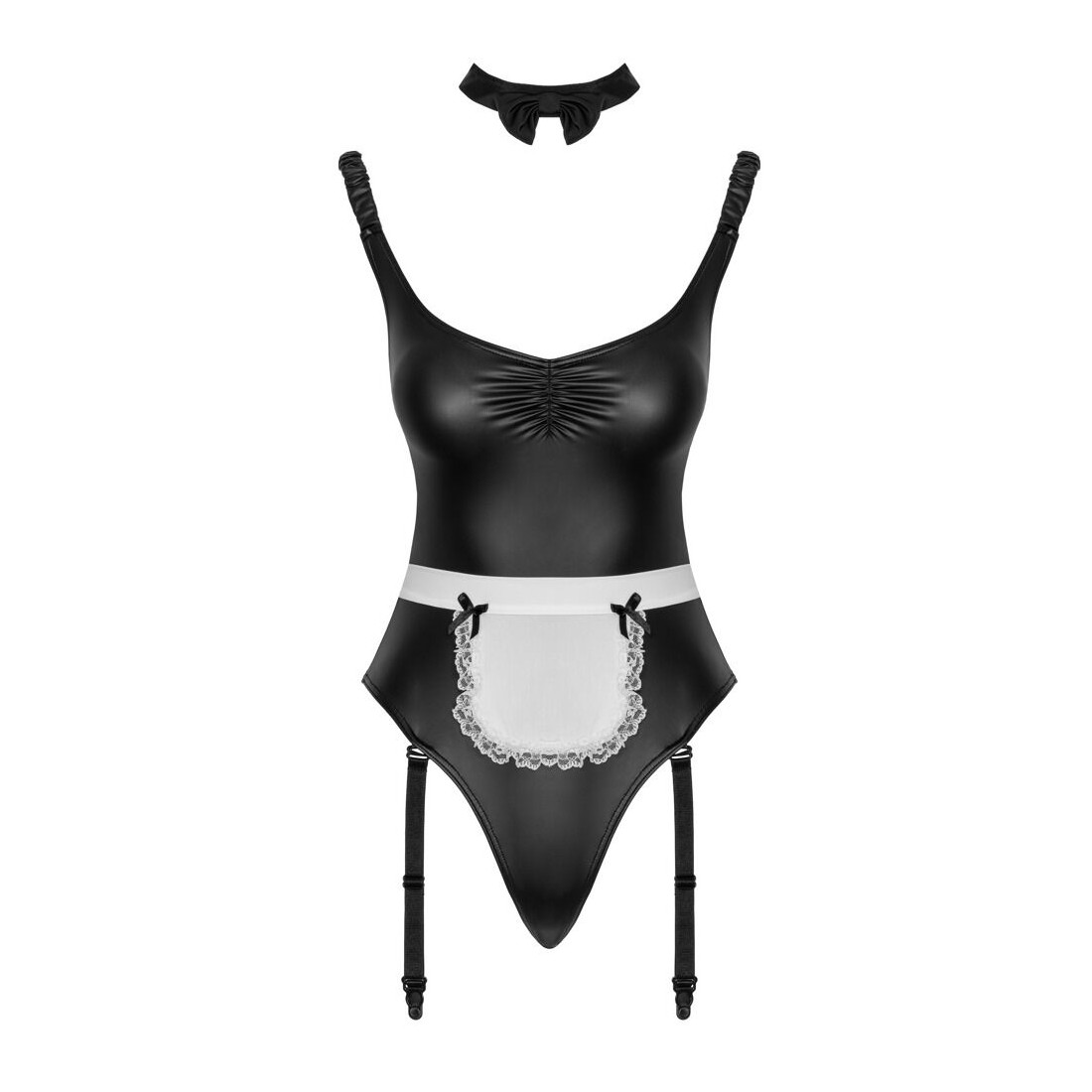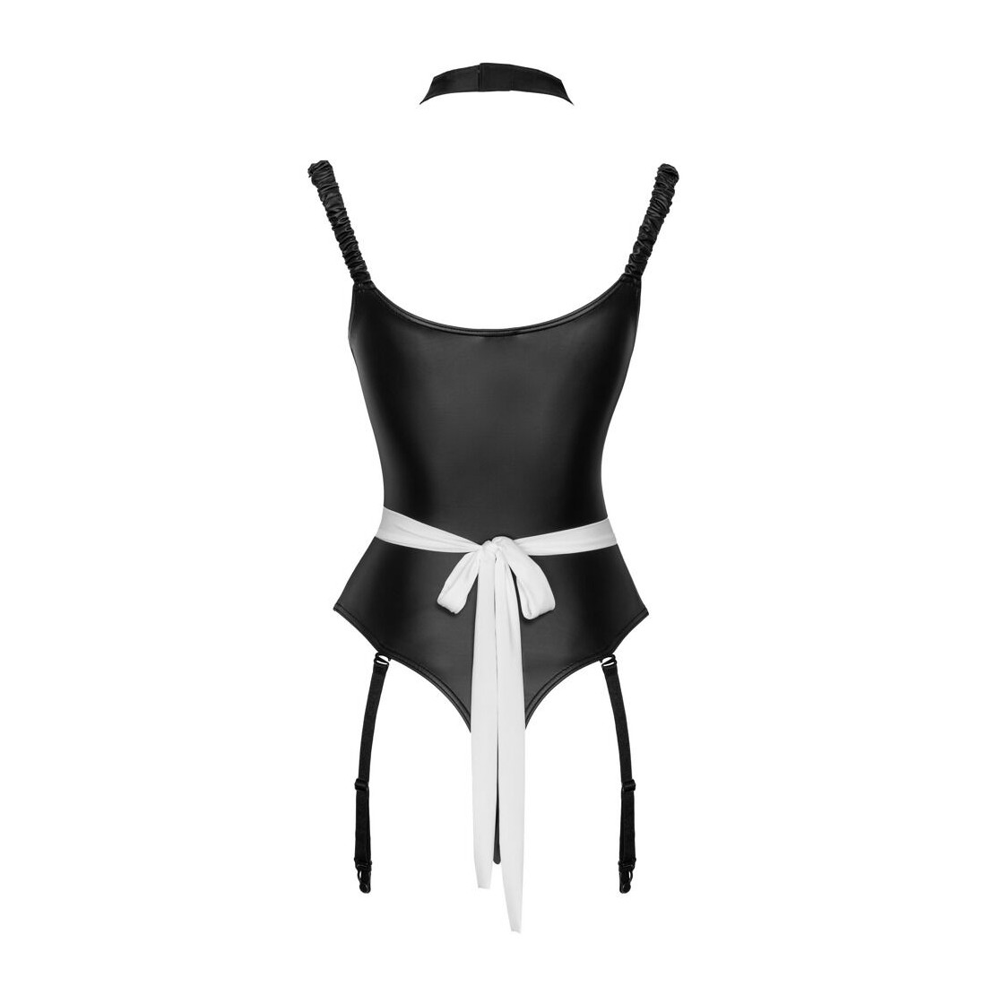 Det lille hvide forklæde med blondekant og det tilhørende halsbånd med sløjfe tilføjer et sødt, flirtende touch, som balancerer perfekt med det ellers frække design. Hver detalje er designet til at pirre fantasien og gøre det let at træde ind i en rolle, der både leger med autoritet og sensualitet.