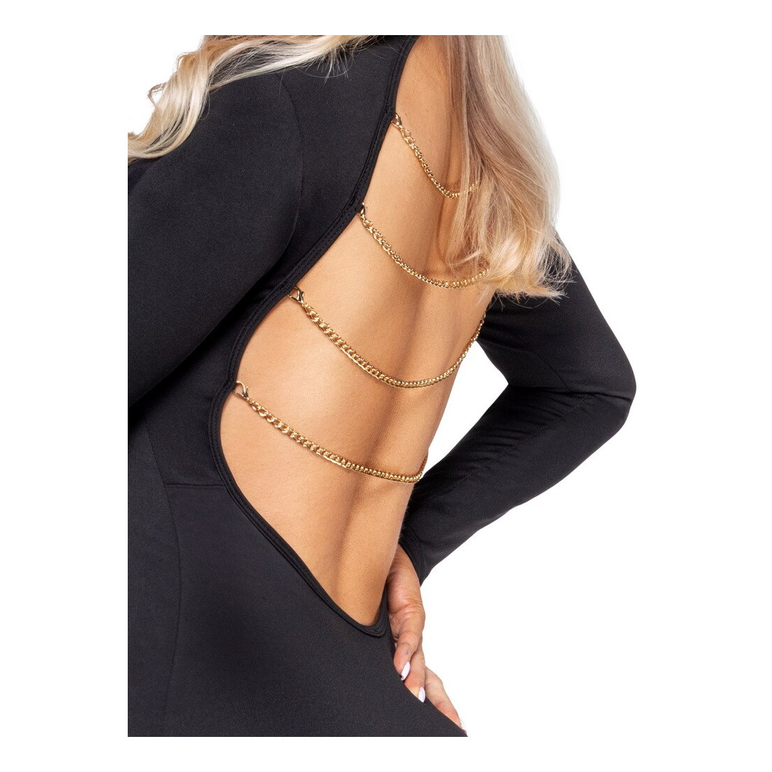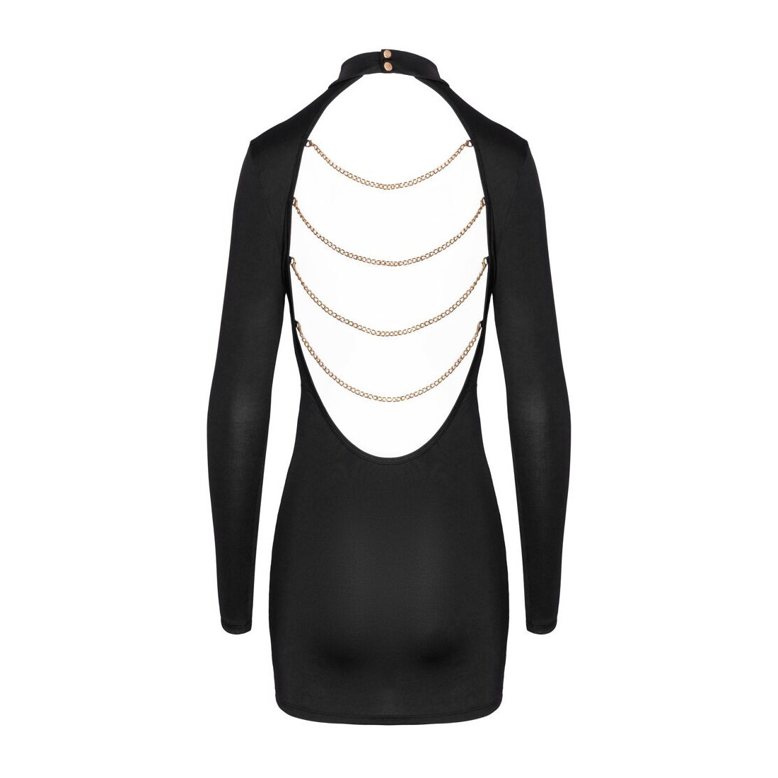 Foran er udtrykket stilrent og enkelt, men når du vender ryggen til, afslører kjolen det, der virkelig gør den interessant og til genstand for rummets sultne blikke. Den dybe rygudskæring brydes af fire guldfarvede kæder, der fungerer som et sensuelt blikfang og tilfører kjolen et eksklusivt og næsten smykkelignende udtryk. Kæderne kan tages af, hvis du ønsker et mere afdæmpet look, hvilket gør kjolen nem at tilpasse både stemning og anledning. Den høje krave lukkes elegant i nakken med diskrete guldfarvede trykknapper og fuldender det sofistikerede udtryk.