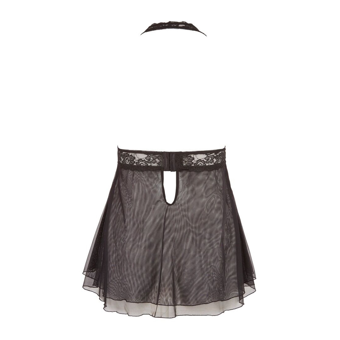 Med denne smarte babydoll-kjole er du perfekt klædt på til en erotisk aften med din kæreste. Toppen er lavet af flot gennemsigtig sort blondestof, der ser meget ædel ud. Den er med halterneck samt kroglukning på ryggen, så du er sikret en optimal pasform. Bh-skålene har en lang lodret slids, som kan lukkes med smalle sløjfebånd. Nederdelen er lavet af to lag sort transparent stof, som svinger løst omkring dine hofter ved hver bevægelse og sætter dine kvindelige former i scene. Det nederste lag stof er lidt længere og skaber en kant, der er mere gennemsigtig end resten af kjolen.