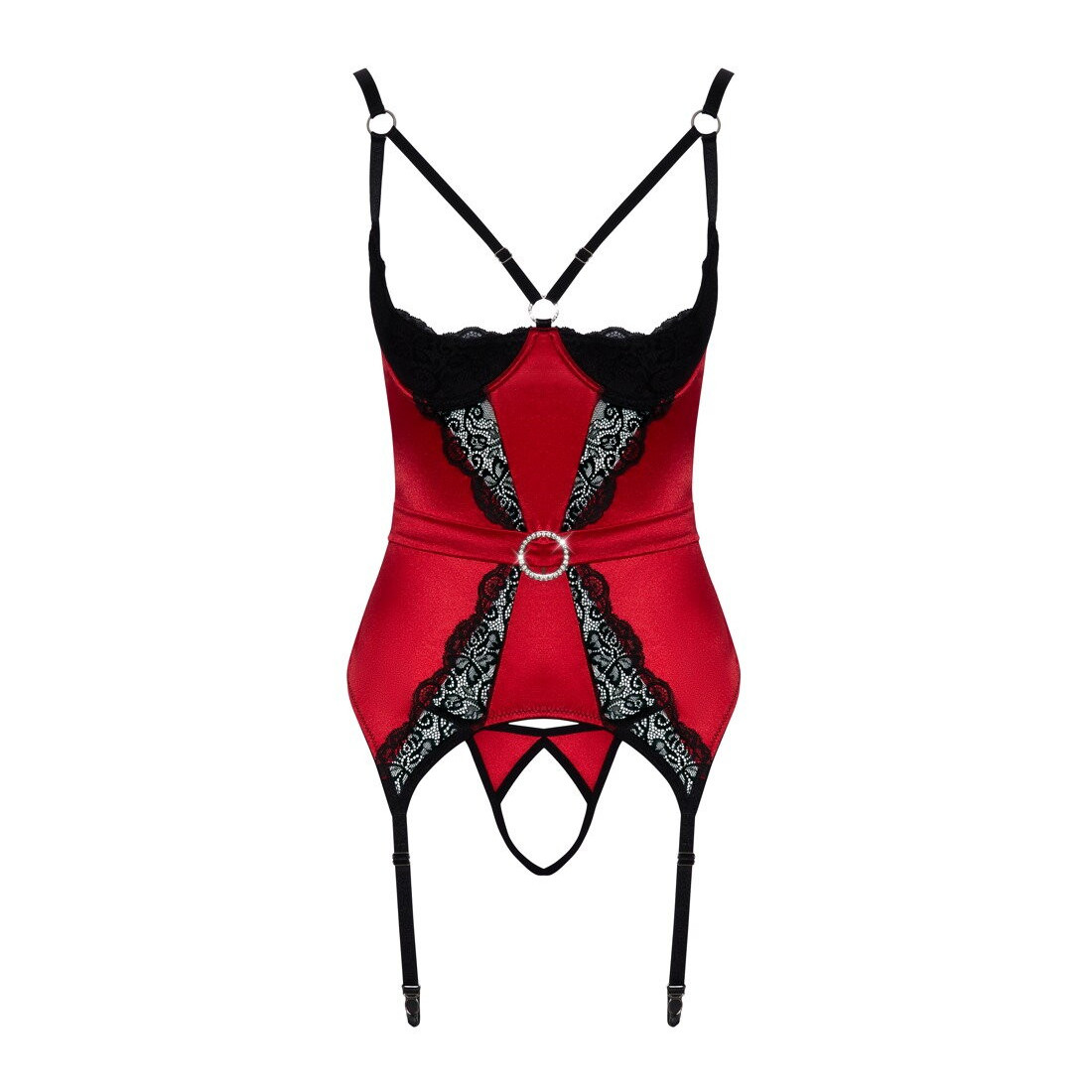 Det særlige ved Cottelli Rødt og Åbent Hofteholdersæt er, at brysterne blottes i den integrerede og forede bøjle-bh. Brystet markeres med sorte stropper og løftes flot af bøjlerne. Sammen med sættet følger en g-streng i samme farver og med åben bund, så vagina ligeledes blottes.
