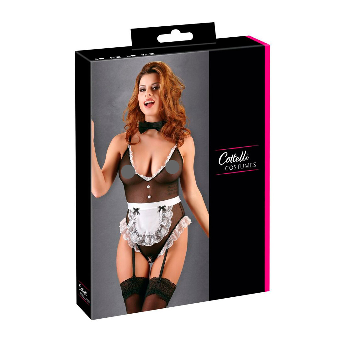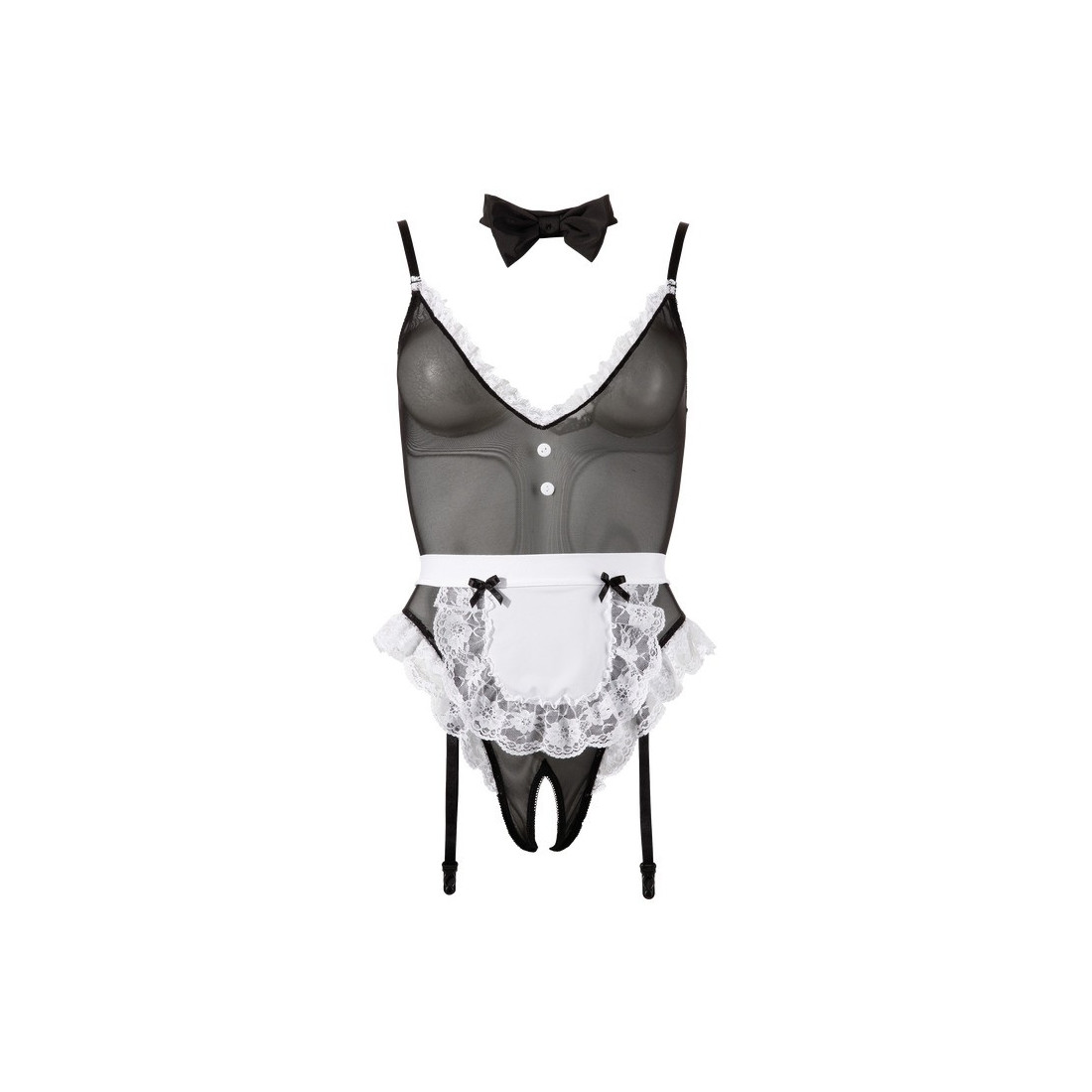 Denne supersexede body er lavet af sort gennemsigtigt og stramtsiddende netstof, der ikke lægger skjul på noget. De tynde skulderstropper er justerbare og garanterer en optimal pasform. Den store halsudskæring tillader et dybt indblik i din kavalergang og er pyntet med en smal hvid blondekant. Også benudskæringen er pyntet med hvidt blondestof. På maven sidder der to hvide knapper, der minder om en skjorte. To aftagelige og justerbare strømpebånd på forsiden gør det muligt at fastgøre strømper (følger ikke med). Den frækkeste detalje er en lang slids i skridtet, der giver fri udsigt på – og adgang til – dine mest intime regioner. Et lille hvidt forklæde med blonder og sorte sløjfer samt en sort butterflykrave med velcrolukning fuldender outfittet.