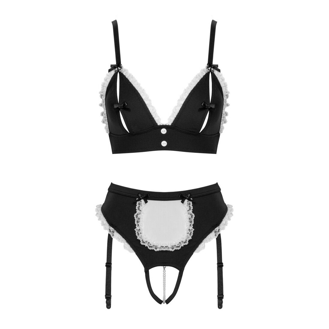 Den sorte overdel med hvide flæsedetaljer og små satinsløjfer fremhæver din figur på den mest pirrende måde. Skålene er udstyret med små flænger, der åbner sig om din smukke barm og lader dig vise lidt mere hud, mens små knapper i midten leder blikket lige dérhen, hvor spændingen begynder. Stropperne kan justeres, så pasformen bliver perfekt – både når du serverer synet af dig, og når du serverer dig selv.