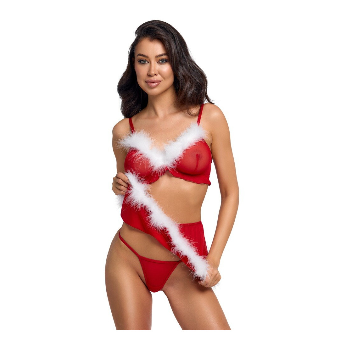Julen har sjældent været så fristende. Dette X-Mas BH og Mini Nederdel Sæt fra Cottelli i en dybrød farve kombineret med hvide og bløde fjer er skabt til at forføre og forstærke stemningen i årets mest glitrende tid. Sættet består af en BH-top, en kort mininederdel og en fræk streng, der sammen giver et legende og uimodståeligt look.