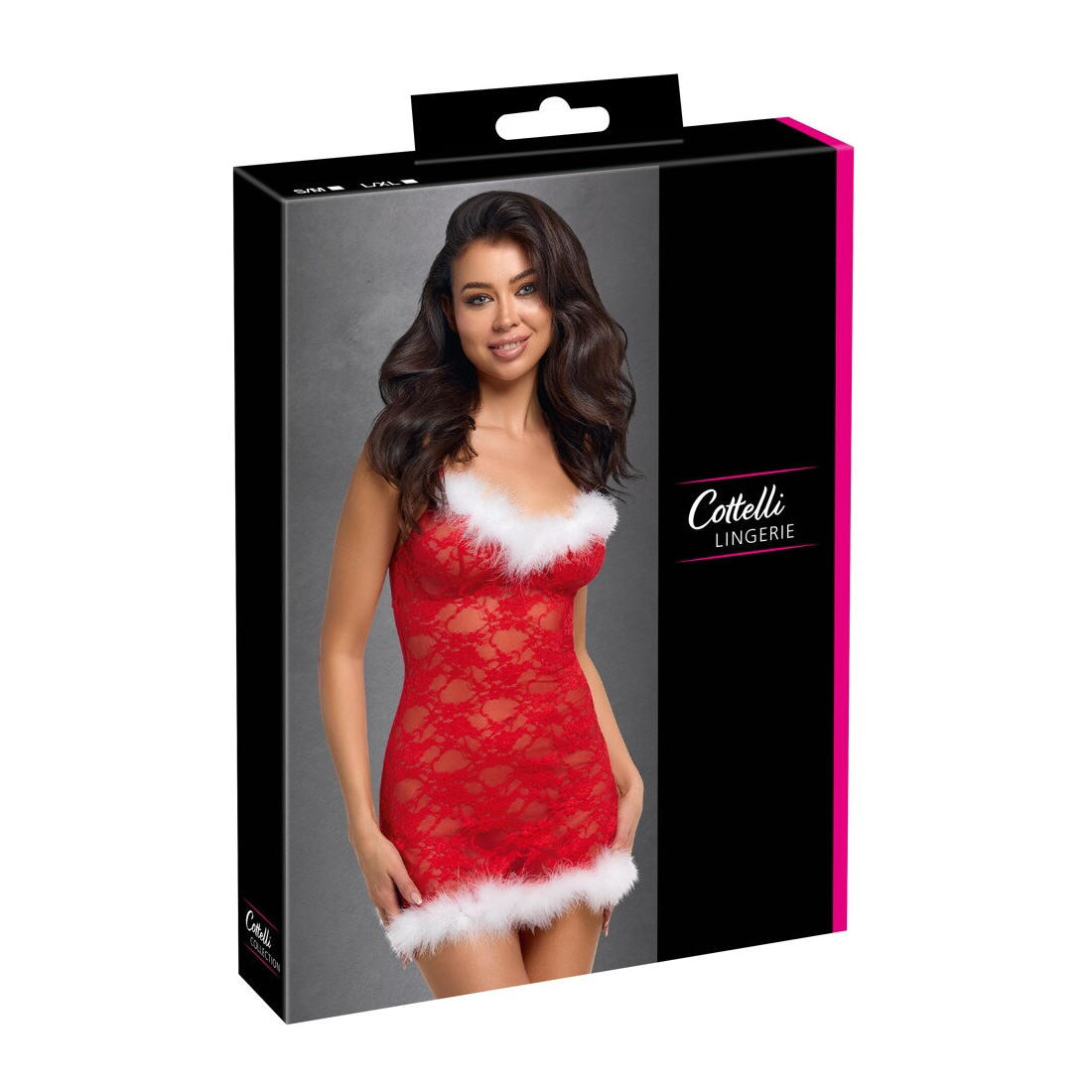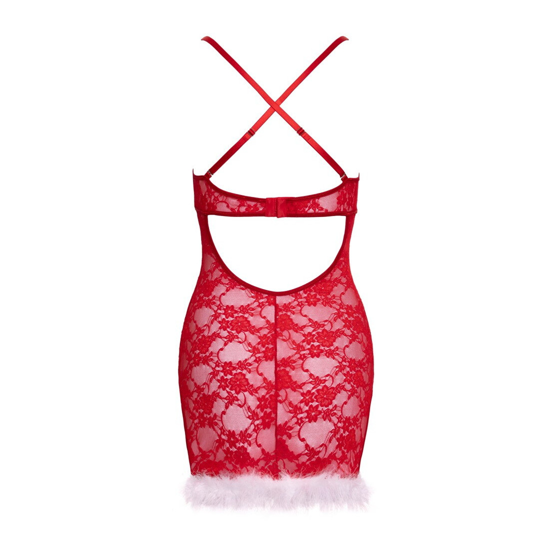 Julen bliver ekstra varm, når du glider i dette forførende røde X-Mas Blonde Neglige fra Cottelli, der kombinerer gennemsigtige blonder og bløde detaljer på en måde, der vækker lysten. Det lette materiale lægger sig tæt til kroppen og fremhæver dine kurver, mens de delikate hvide fjer på skålene og langs underdelen giver sættet et festligt og frækt udtryk.
