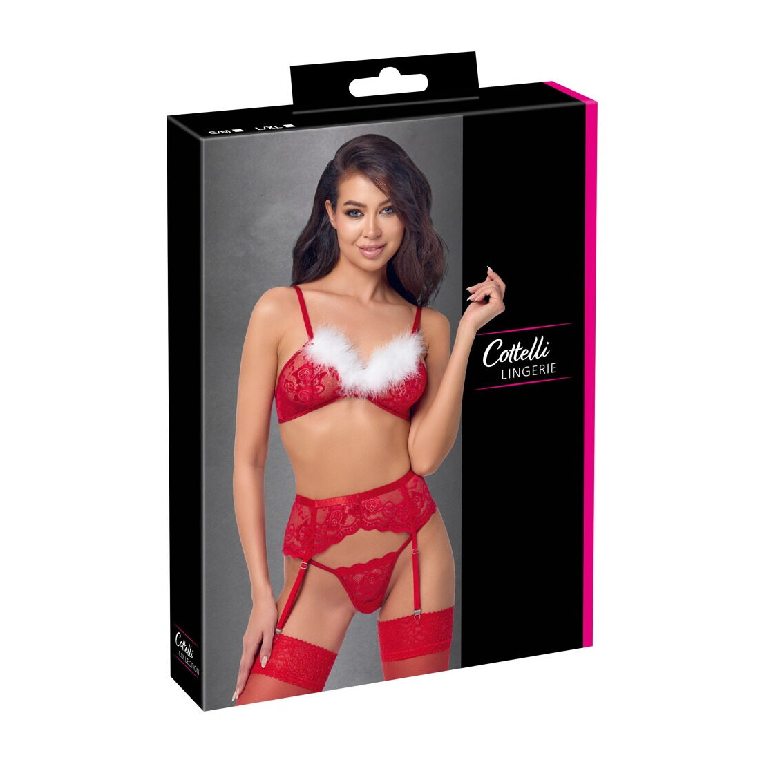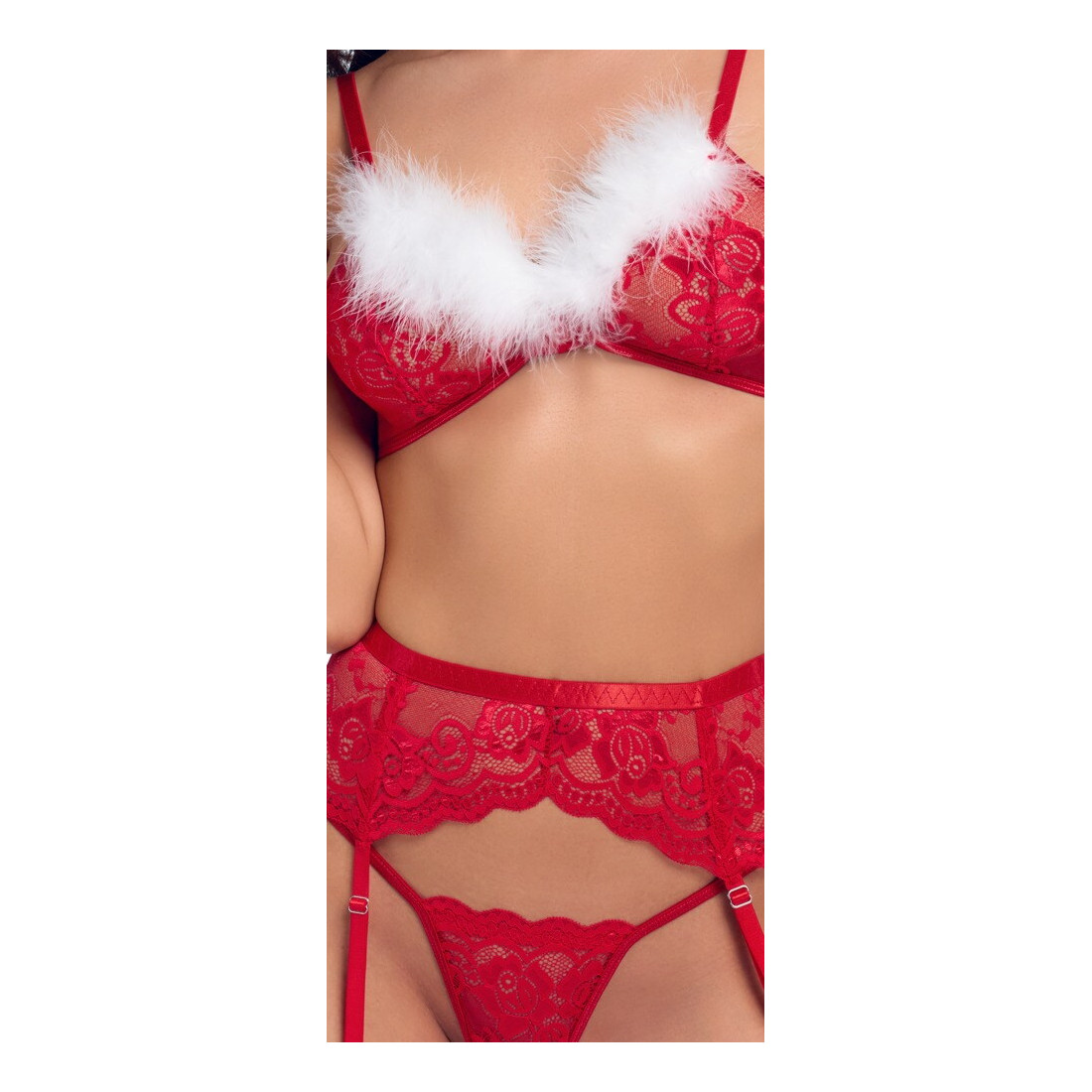 Forfør og forkæl sanserne med dette frække tredelte X-Mas Lingeri Sæt fra Cottelli i festlige røde blonder. Sættet består af BH, stroppebånd og streng, som sammen skaber et elegant og pirrende look. De bløde blondeskåle på BH’en er pyntet med hvide, lette fjer, der giver et sødt, næsten legende modspil til det ellers dristige design.