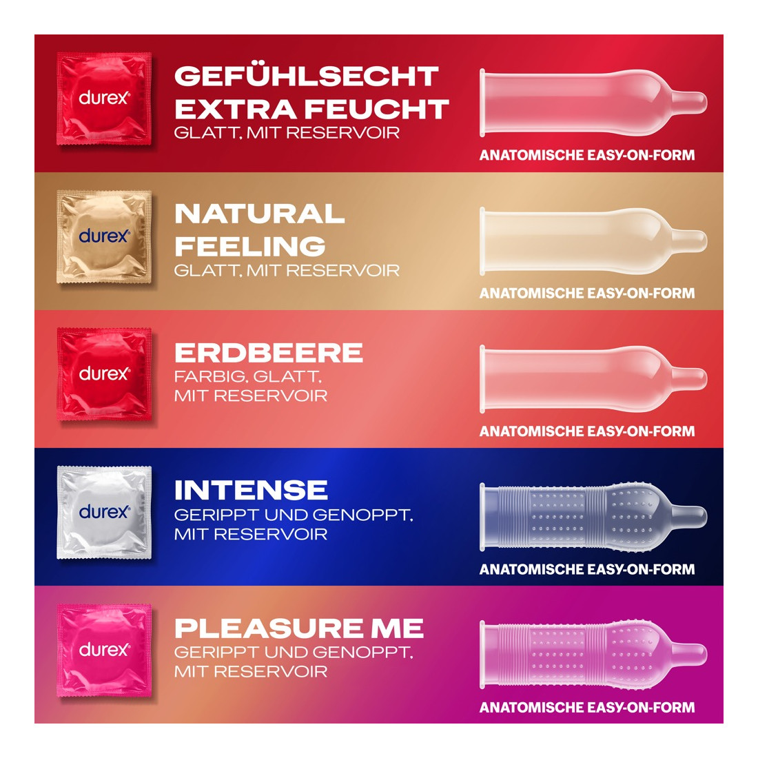 Denne kondompakke er til dig, der elsker at eksperimentere og er på jagt efter nye, spændende og frække oplevelser. Her får du 5 forskellige slags kondomer, der garanterer sikker og nydelsesrig sex for både dig og din partner. Prøv for eksempel det klassiske London Red kondom med en lækker jordbærsmag, eller Pleasuremax med ekstra pirrende riller og knopper. Det ekstra fugtige Emotions kondom vil give dig en særlig smidig og nydelsesrig sexoplevelse. Savner du den intense, naturlige følelse, når du har sex med kondom, så vælg det ekstra tynde Sensitive kondom eller det endnu tyndere Natural Feeling kondom i latexfrit RealFeel-materiale, der giver dig den fantastiske følelse af hud imod hud – du vil ikke kunne mærke, at du bruger et kondom.