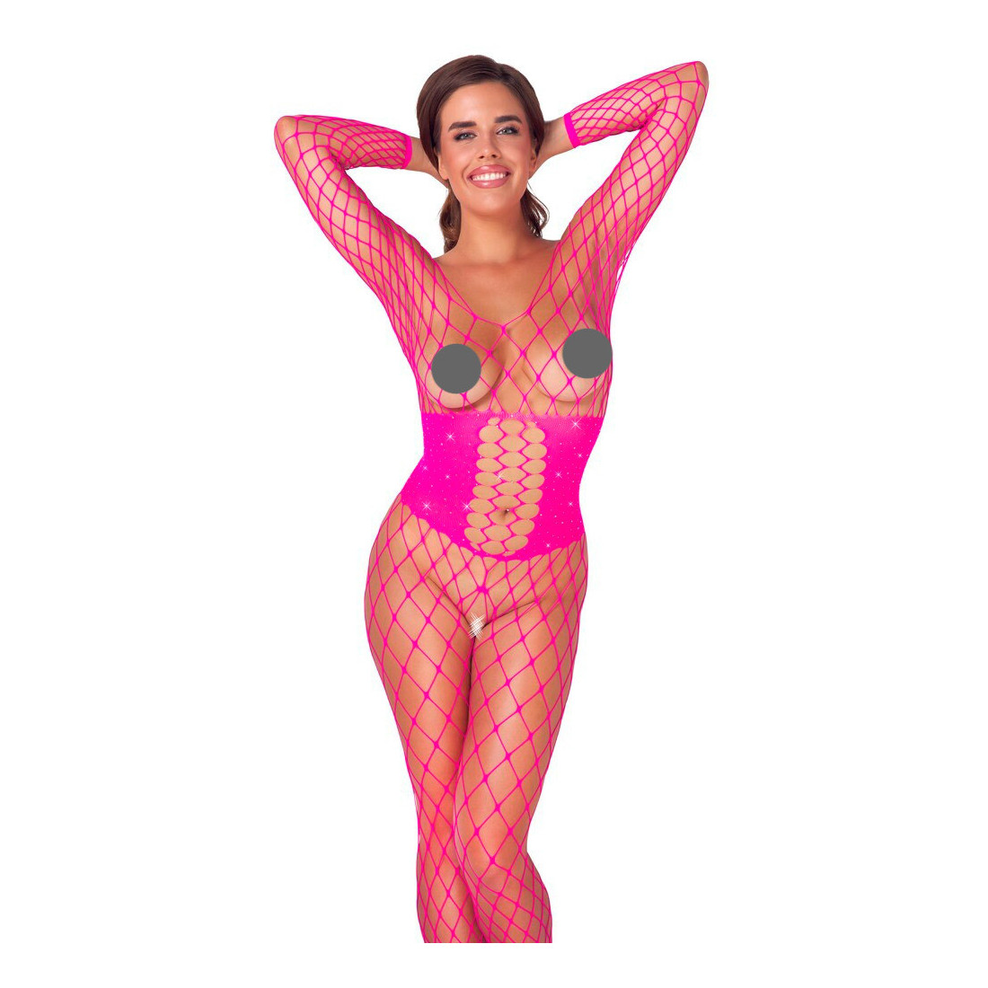 Glæd dig til et catsuit i strækbart net, som bare passer. Det lyserøde catsuit har ingen syninger og dermed intet, der kan nage eller irritere, mens du har det på. Maskerne er ekstra store, og dragten bundløs, så du er nem at komme til. Midterstykket omkring taljen er tættere vævet og udsmykket med funklende rhinsten. Strømperne har forstærket tå.