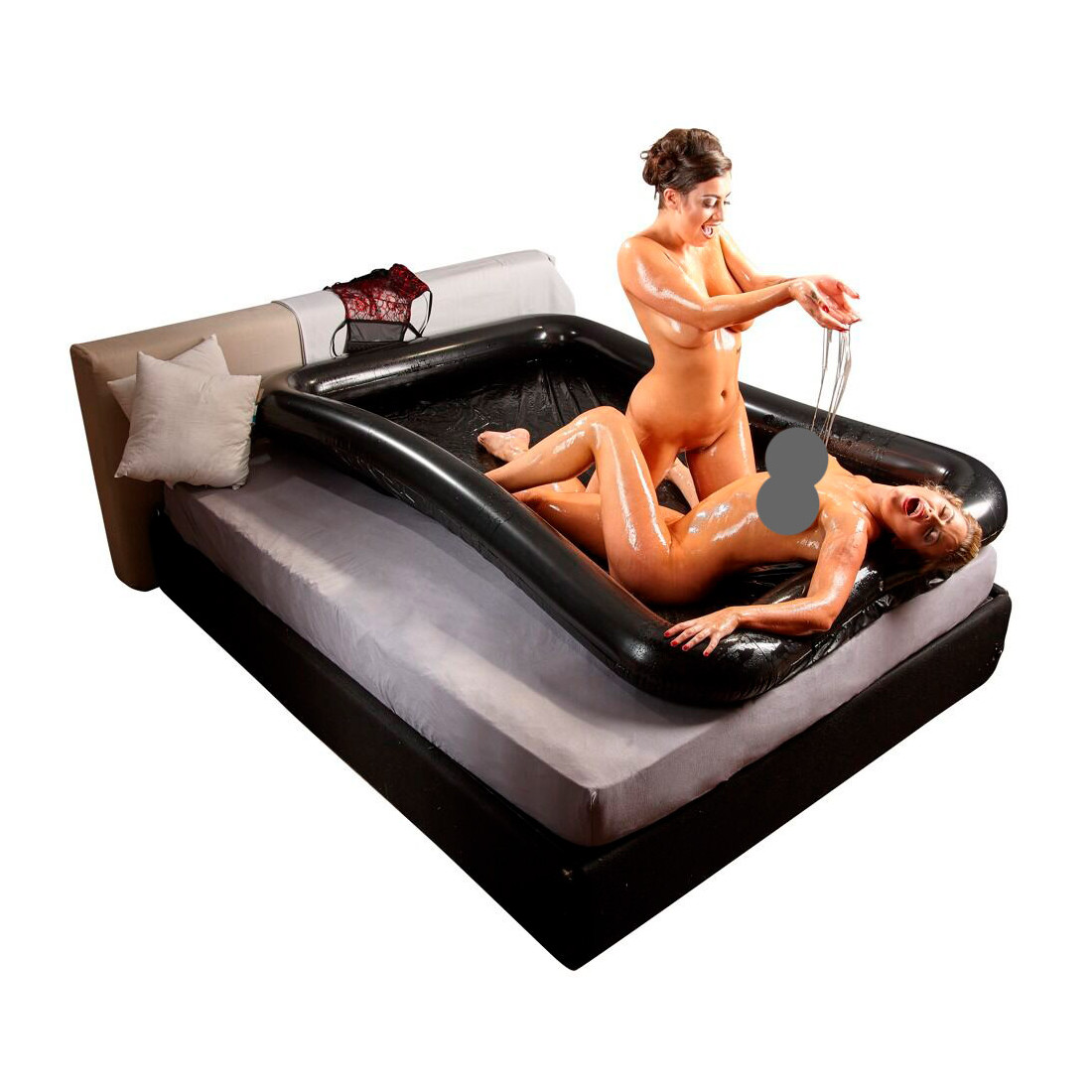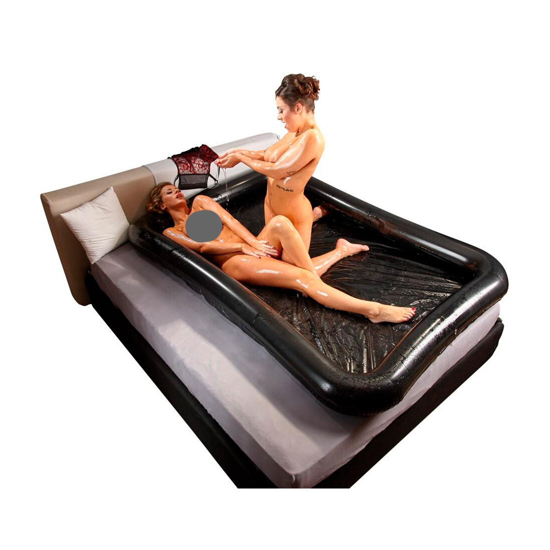 Elsker du også den våde og glatte følelse, når du leger med både glidecremer og massageolier? Og ville du ønske, at du kunne hælde en hel flaske olie ud over din date uden at lave en masse svineri derhjemme? Så har vi den perfekte løsning til dig: nemlig dette frække lagen i lak med en høj oppustelig kant. Det er lige før, det ligner et lille bassin, som du kan fylde med lidt sjovere ting end vand.
