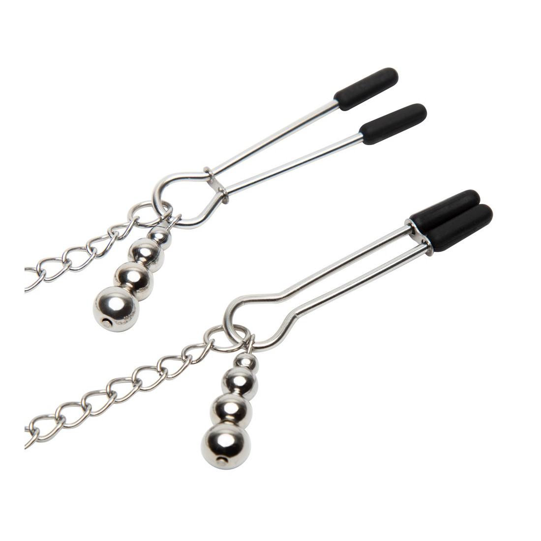 Brystklemmerne er justerbare, så I kan stramme eller løsne klemmerne undervejs. Jo mere du skubber den lille glidering op mod silikoneklemmerne, jo strammere vil det føles på dine brystvorter. I kan derfor eksperimentere med alt fra bløde, nivende fornemmelser til hårdt klemte brystvorter, som svier og trækker i huden. Perfekt, hvis du vil udforske grænser og stille og roligt træne dig til vildere bondageleg.