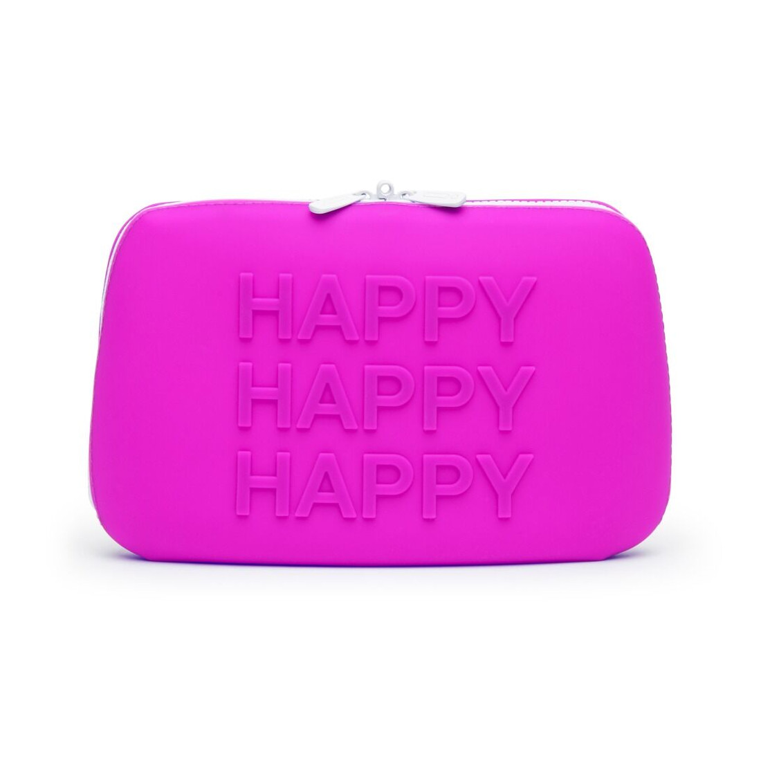 Sidst – men ikke mindst – kan du vælge den store størrelse, hvis du skal have mere legetøj med dig. Det perfekte valg, hvis du fx er væk i flere dage ad gangen og gerne vil vælge mellem lidt forskelligt. Tasken er pink med hvid lynlås og teksten “HAPPY” på siden.