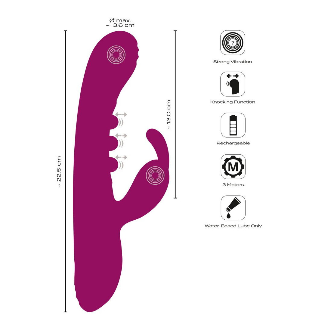 De tre kraftige, men støjsvage, motorer giver dig mulighed for at lege med tempo, rytme og intensitet, uden at oplevelsen føles overvældende. Alt styres nemt via knapper, så du kan finde præcis den kombination, der passer til din krop og dit humør. Det bløde silikonemateriale føles naturligt mod huden, og den fleksible klitorisstimulator former sig efter dine bevægelser, så din næste orgasme stille og roligt kan begynde – og pludselig eksplodere i våd ekstase.