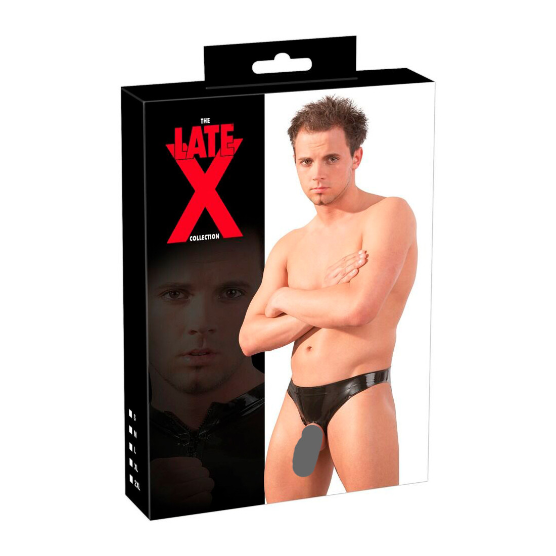 Ved første øjekast ligner det en helt almindelig trusser i latex. Men kigger du bedre efter, vil du opdage et stort hul i gylpen. Trusserne er nemlig designet, så du kan føre både penis og testikler ud gennem hullet, så begge dele får lov at hænge – eller stå – frit. Perfekt, hvis du leder efter et outfit til en fræk aften derhjemme, eller hvis du skal til en sexfest ude i byen.