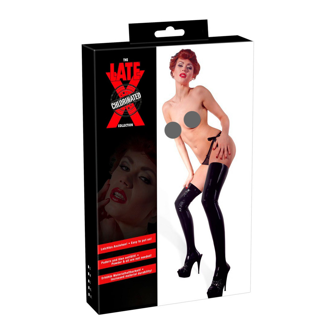 Latextøj ser ikke kun utrolig frækt ud, det giver dig også en herlig stram fornemmelse, idet materialet er utrolig elastisk og smyger sig tæt omkring din krop. Har du allerede erfaring med strømper i latex, så har du sikkert oplevet, at det kan være lidt af en kamp at komme ind i dem. Løsningen kan være at påføre smørelse eller pudder indvendigt, så materialet glider nemt henover huden. Med disse smarte latexstrømper fra Late X slipper du nu helt for den slags hjælpemidler. Strømperne er nemlig klorerede indvendigt, så overfladen ikke klæber til huden – således kan du nemt og hurtigt iføre dig dine lækre latexstrømper. En anden fordel ved behandlingen med klor er, at den kan mindske en eventuel latexallergi.
