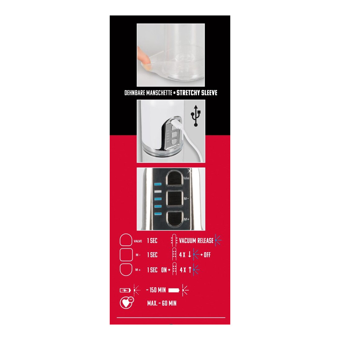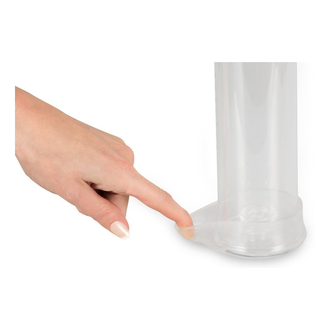 Det gennemsigtige cylinderdesign med indbygget måleskala giver dig fuldt overblik over din udvikling, så du kan følge med i, hvordan din erektion vokser og bliver kraftigere. Den bløde silikone slutter tæt omkring penisroden, så vakuummet opbygges hurtigt og effektivt. Ved hjælp af knapperne på skaftet kan du selv styre trykket, så det passer til dit behov – fra let træning til kraftfuld stimulation. Når du er færdig, slipper du nemt vakuummet via ventilen.