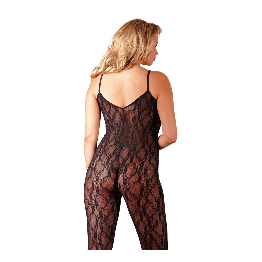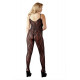 Catsuitet overdel består af et udsøgt blondemønster, der dækker mave, bryster og ryg og holdes oppe af to smalle stropper. Hen over kavalergangen løber et elegant snøremønster, der leder tankerne hen på fristende korsetter og giver et bondageinspireret udtryk. Catsuitens underdel består af de samme fine sorte blonder, der dækker begge ben og fødder i en tætsluttende figur og desuden har en slankende effekt på dine ben.