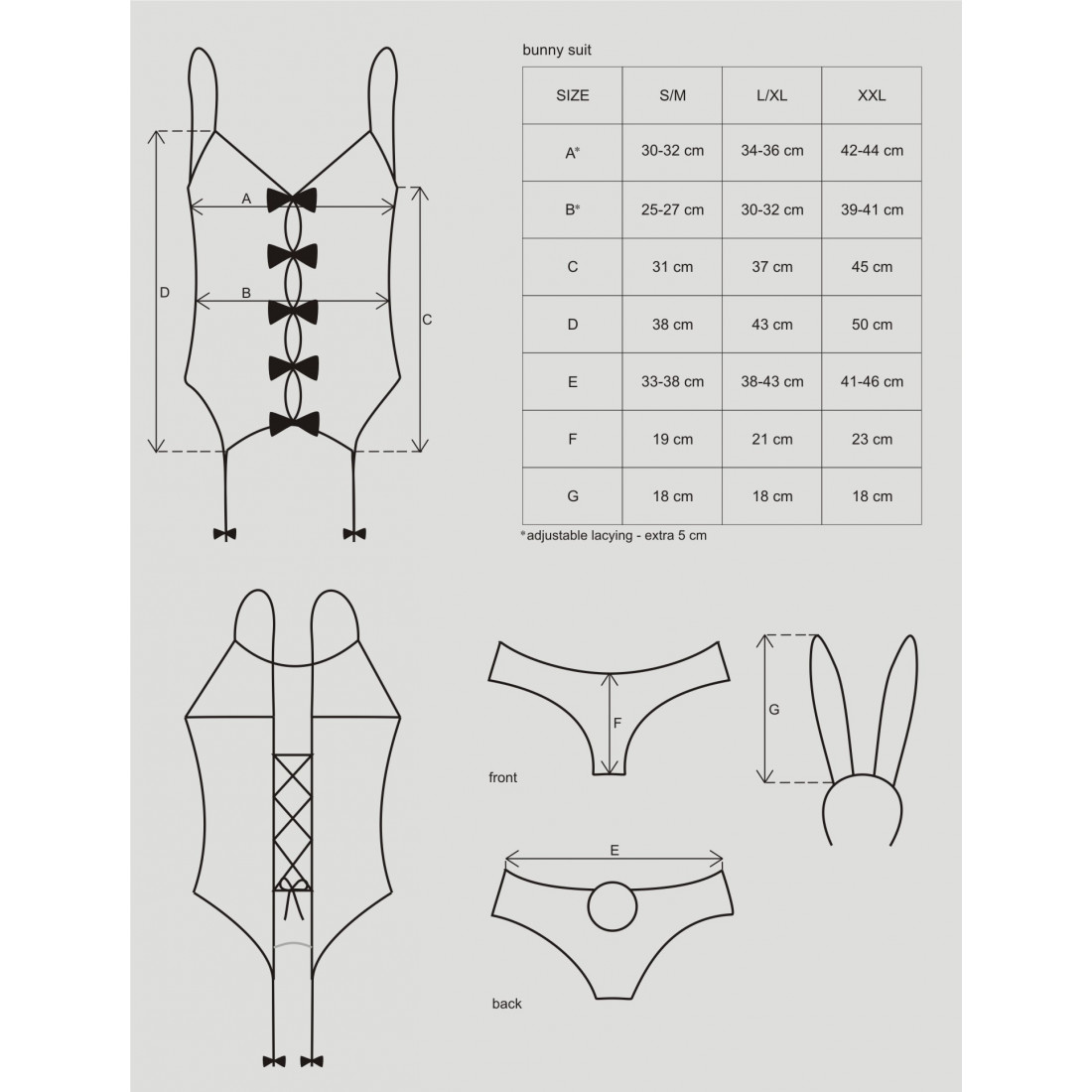 Corsagen er lavet i et elastisk materiale, der smyger sig tæt omkring dine former. Den har en dyb halsudskæring og en gennemgående slids på fronten, der holdes sammen via fem flotte hvide sløjfer. Bagtil er den næsten helt åben, og så har den en snøring på ryggen samt justerbare skulderstropper, så den sidder helt perfekt på dig. Strømpebånd med de samme hvide sløjfer gør det muligt at fastgøre de medfølgende hvide netstrømper. Trussen matcher corsagen perfekt og er lavet med en påsyet kaninhale på numsen. En hårbøjle med hvid-pinke kaninører med sløjfer på kompletterer det søde og sexede look.