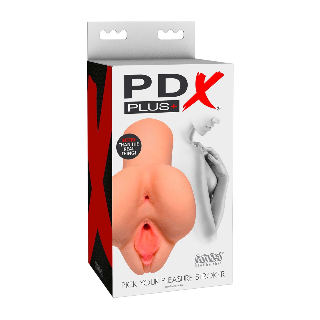 PDX Plus Pick Your Pleasure Stroker har et naturtro skede- og anuslook, hvor begge huller har forskellige stimuleringsstrukturer i form af riller og knopper, der kan massere penis under brug for en mere intens udløsning. Den er designet til at være fleksibel og ligger tæt og sikkert i hånden, så du kan roligt holde og gribe fat i den, som du ønsker. Det naturtro udseende kommer fra Fanta Flesh-materialet, som ligner hud og er blødt at røre ved.