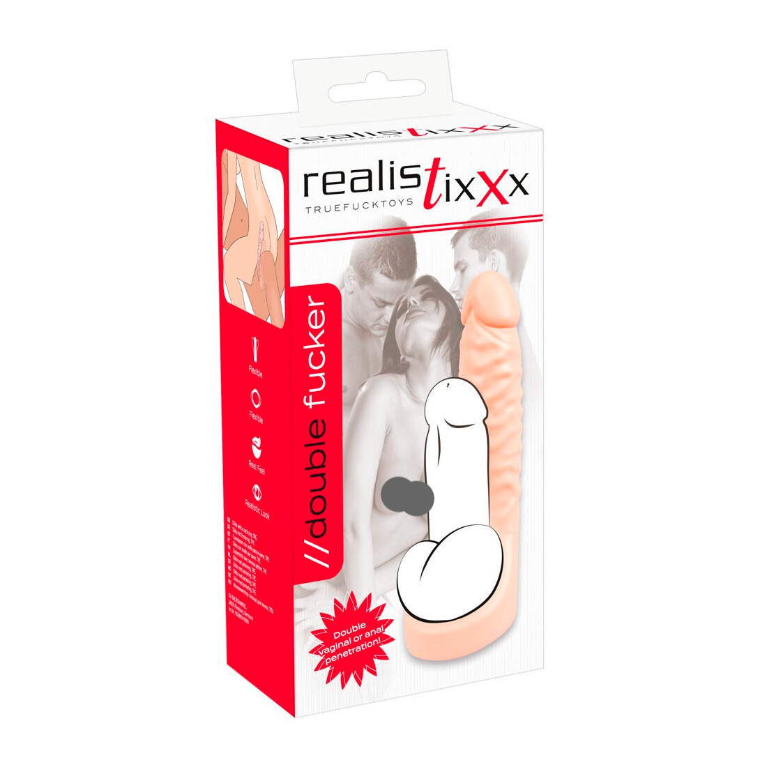 Med Realistixxx Double Fucker får du nemlig en naturlig dildo, der både ligner og føles som en rigtig penis, kombineret med en strækbar penisring – og på den måde er både modtageren og bæreren sikret intensitet og fantastisk nydelse. Produktet kan benyttes sådan, at man placerer penis eller vibrator i penisringen, langs den indbyggede dildo. Penisringen, der har en omkreds på 4 cm, kan udvides og justeres, sådan at dildoen placeres helt optimalt i forhold til din egen penis. Nu udstyret med hele to skafter, er du klar til at give en heldig modtager den utrolige følelse af dobbelt penetration – enten vaginalt eller analt.