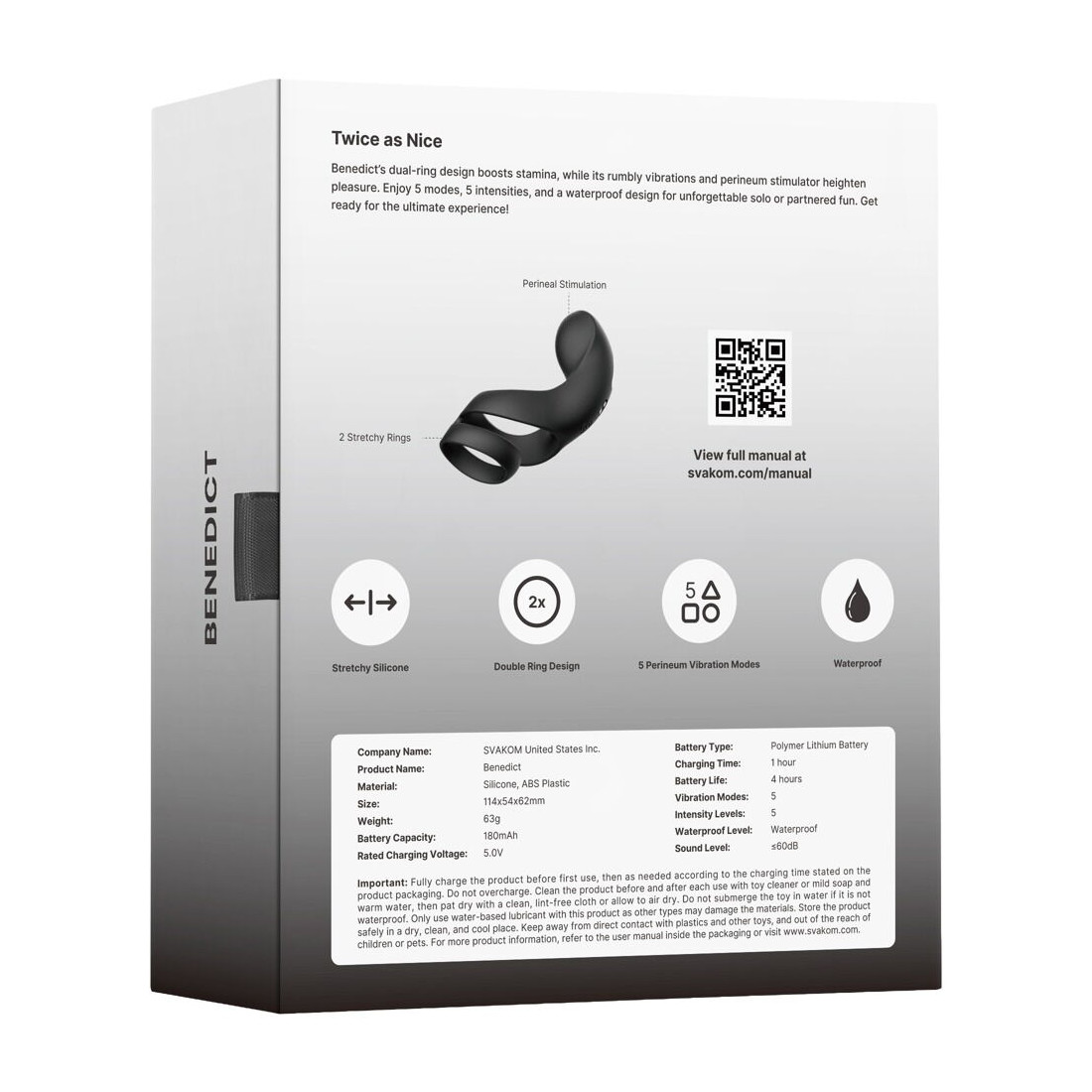 Svakom Benedict Dobbelt Penisring med Vibrator er fremstillet i et yderst fleksibelt materiale. Det vil sige, at den passer perfekt på (stort set) hvem som helst – uanset størrelse og form. Den dobbelte penisring har fem forskellige vibrationsindstillinger. Du kan altså få det, lige som du gerne vil have det.