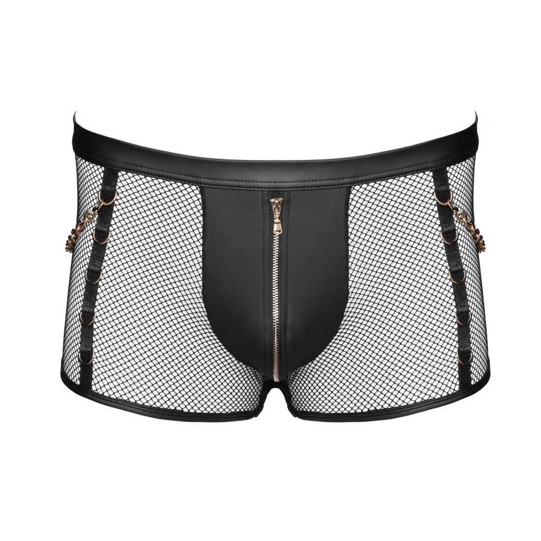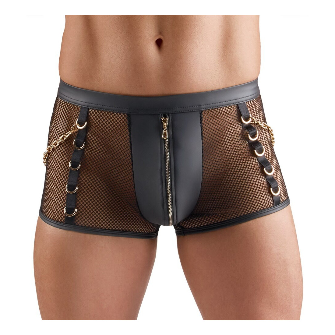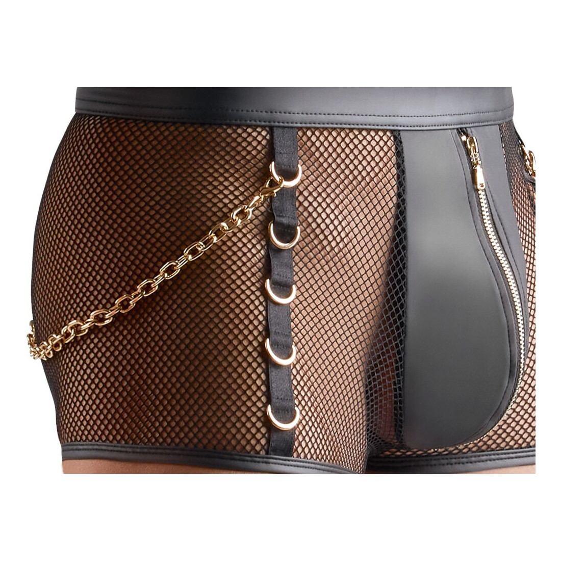 De guldfarvede ringe foran på siderne og bag på linningen er både elegante og pirrende, mens de aftagelige karabinkæder giver dig mulighed for leg og fræk variation. Vil du afsløre lidt mere eller drille din beskuers fantasi? Lynlåsen på den ugennemsigtige front er ikke bare praktisk, men tilføjer også et lille ekstra pikant touch, hvor du kan lade spænding og nysgerrighed vokse.