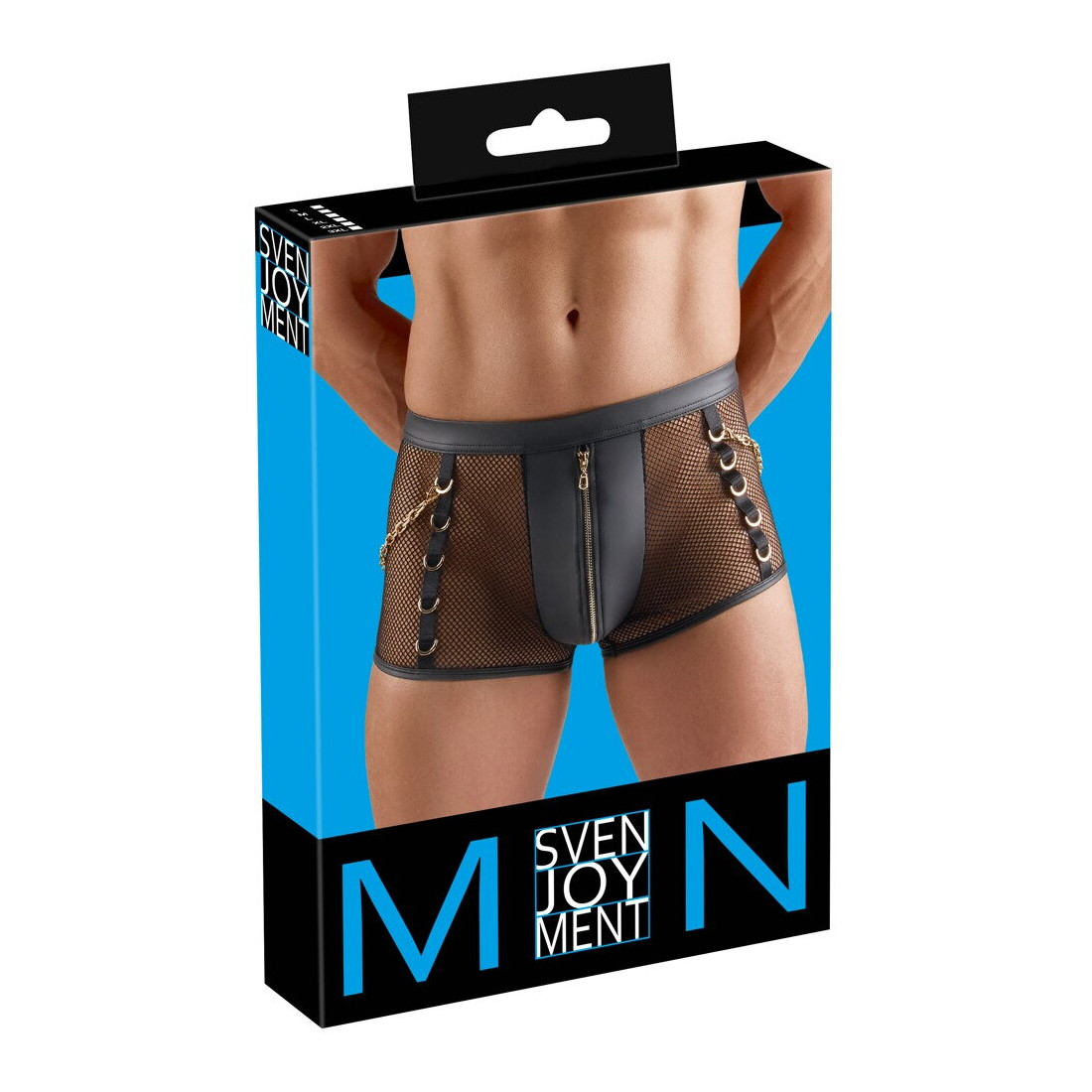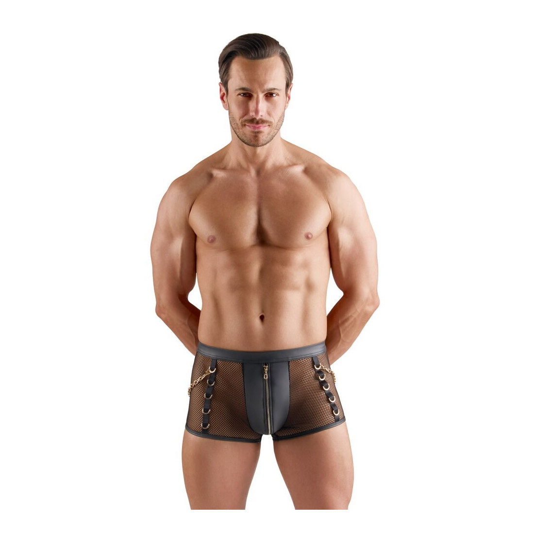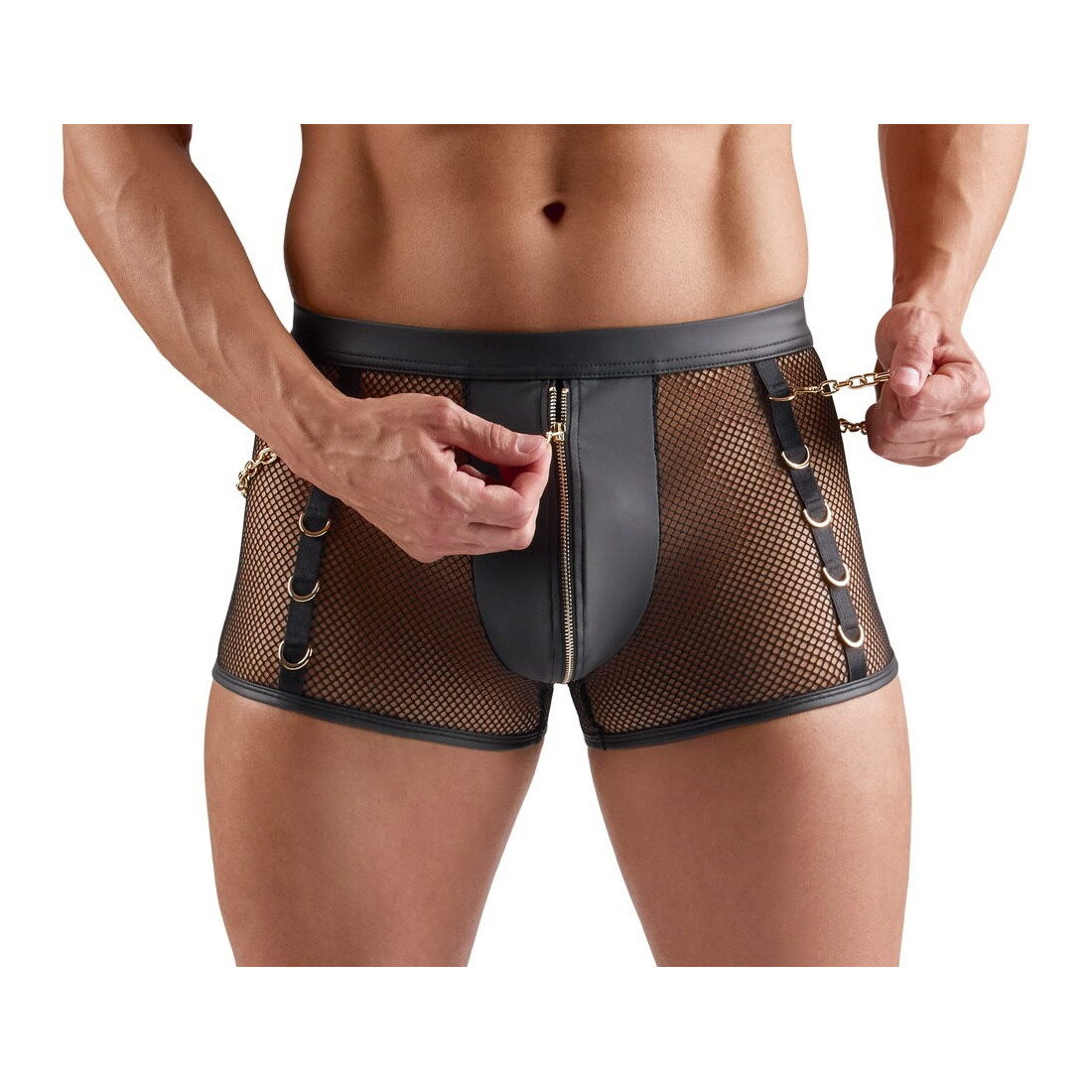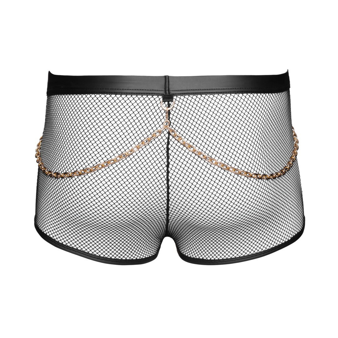 Hvis du vil tænde for forførelsen og pirre sanserne fra første sekund, er disse sorte net-pants med karabinkæder fra Svenjoyment lige sagen. De leger med gennemsigtighed og wetlook-detaljer på en måde, der får fantasien til at løbe løbsk og får dig til at føle dig uimodståelig og selvsikker. Pantsene sidder blødt og elastisk, former sig perfekt efter dine hofter og fremhæver dine kurver på en forførende måde, så du er klar til at friste dig selv, din partner eller enhver anden, der oplever synet af dig.