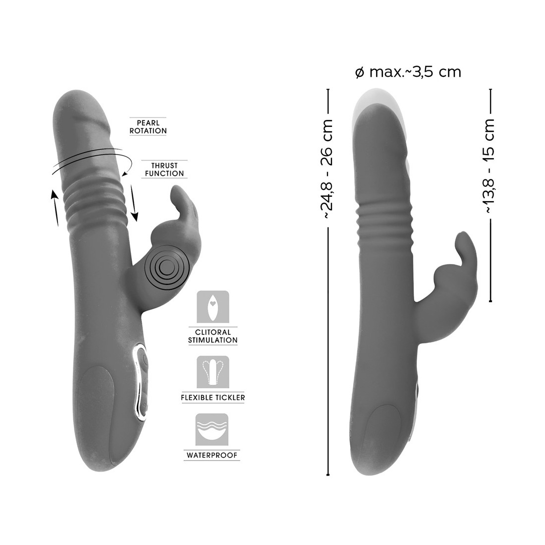 To tredjedele nede sidder der en ”kanin” med ”ører”, der vibrerer i takt med den valgte vibration. Ørerne er designet til at kilde din klitoris, imens du har skaftet oppe i din vagina. Brug knappen i bunden, når du vil starte og veksle mellem vibrationerne, og læn dig tilbage og nyd det hele!