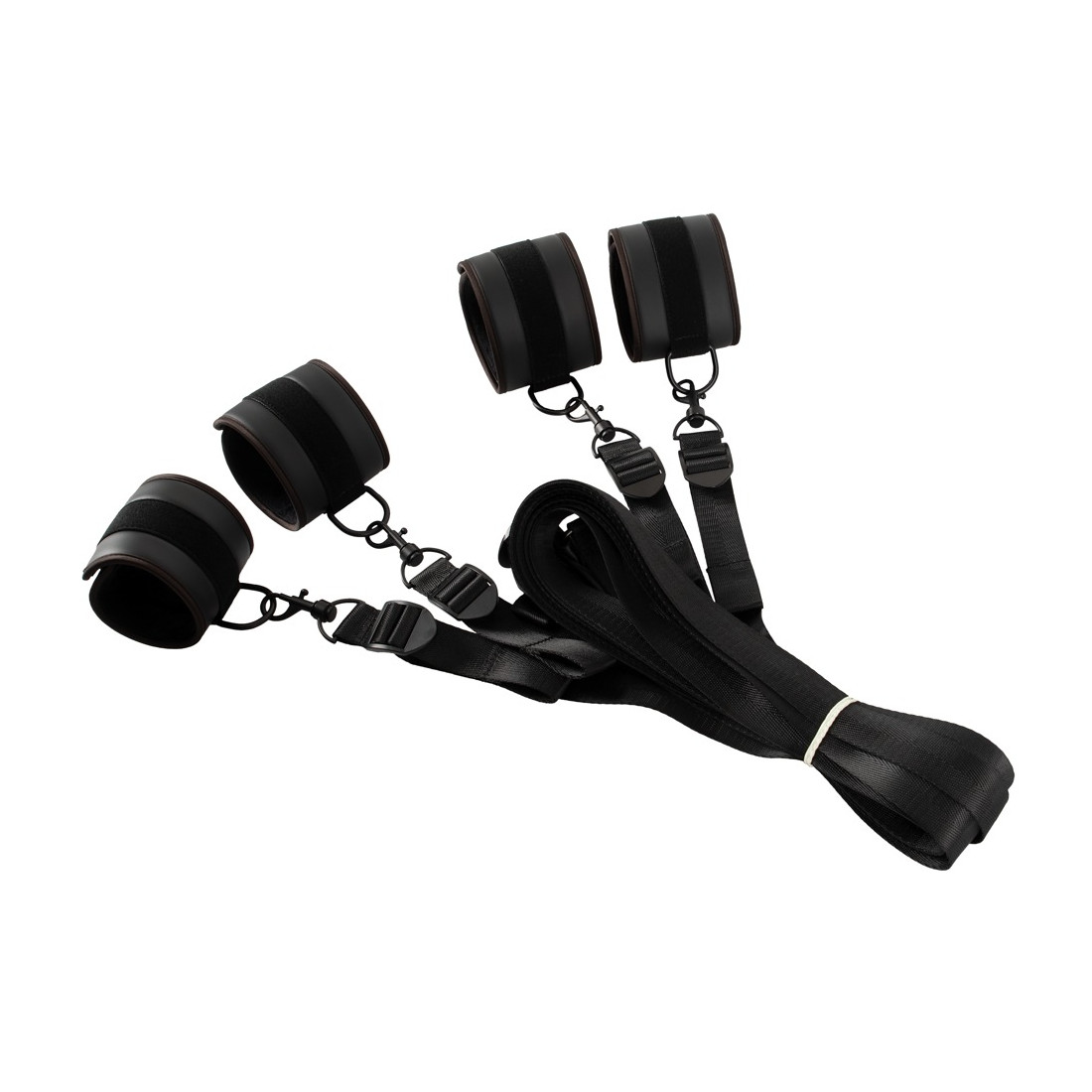 Sættet er holdt helt i sort og kan let justeres, så det passer til de fleste senge, så I kan lege med kontrol og fratage hinanden bevægelsesfriheden – alt efter hvem der står for skud.