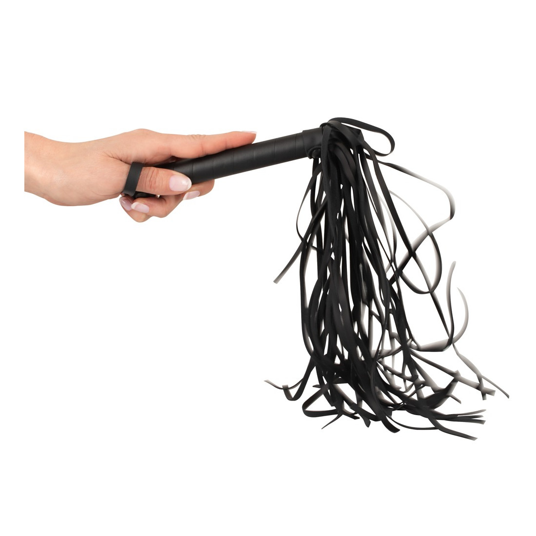 Den medfølgende pisk er en blød flogger, der egner sig fint til både begyndere og øvede indenfor det kinky univers. Snørerne har en længde på 43 cm, der giver mulighed for både tirrende berøringer af huden under forspil, opvarmning og hurtige og smertefulde slag, der får huden til at gløde rødt.