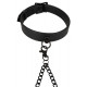 På fronten af halsbåndet er en ring, hvor du med en lille karabinhage kan fastgøre to metalkæder på en længde på 65 cm med en brystklemme i hver ende. Du kan derfor bruge halsbåndet alene eller peppe det ekstra op med brystklemmerne for en ekstra smertefuld detalje til legen.