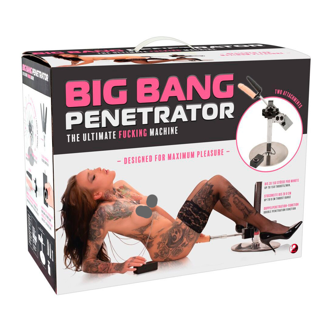 Drømmer du om et brag af en sexmaskine, skal du hoppe på Big Bang Penetrator fra You2Toys. Det anderledes rustikke design springer i øjnene, for Big Bang Penetrator ligner ikke de fleste andre sexmaskiner. Men du må ikke lade dig snyde. Det her er en dildo maskine, som kan betjene dig fra alle vinkler med flere dildoer ad gangen. Med følger en sort anal dildo og en realistisk dildo i lys hudfarve. De to frækkerter kan endda monteres samtidig, og pludselig har du en utrættelig dobbelt dildo.