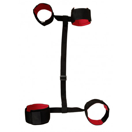 Sættet består af tre dele: To sæt manchetter og en rem, der forbinder dem med hinanden. Manchetterne har en blød polstring, så de er behagelige at have på. De lukkes med velcro og kan altså tilpasses i omfang. Det ene sæt manchetter er meget kort, mens det andet er en del længere. Remmen i midten er justerbar i længden. Det smarte bondage sæt byder på et hav af muligheder til fiksering, idet du kan binde din partner foran eller bagved kroppen, du kan vælge, hvilken vej du vender sættet, og du kan variere afstanden mellem manchetterne, så du kan fiksere din partner i mange forskellige positioner. Bondage sættet egner sig både til kvinder og til mænd.