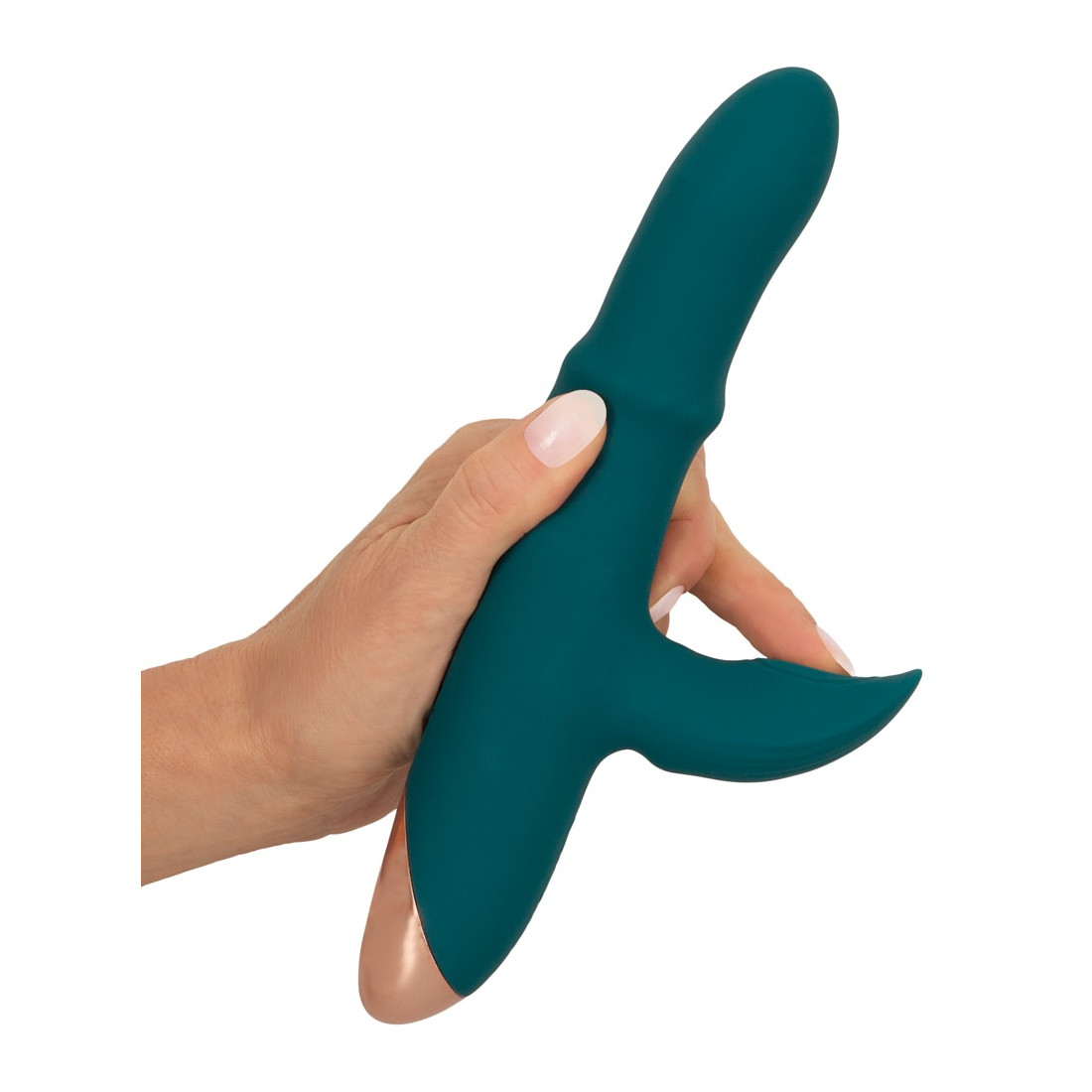 Dette er ikke din klassiske rabbit-vibrator. Den har nemlig fået et kinky nyk op på nydelsesskalaen. Den er for din fornøjelses skyld blevet udstyret med en bevægelig ring på skaftet, som har 10 forskellige rytmer, som den kan massere dig med indvendigt i din vagina. I den svulmende spids af skaftet, som svarer til glansen, er en vibrator med syv vibrationsmønstre. Sidst, men ikke mindst, kommer du til at elske de dunkende bevægelser, som klitorisstimulatoren laver, hvor den tapper – i hele 7 forskellige rytmer – på din klitoris.