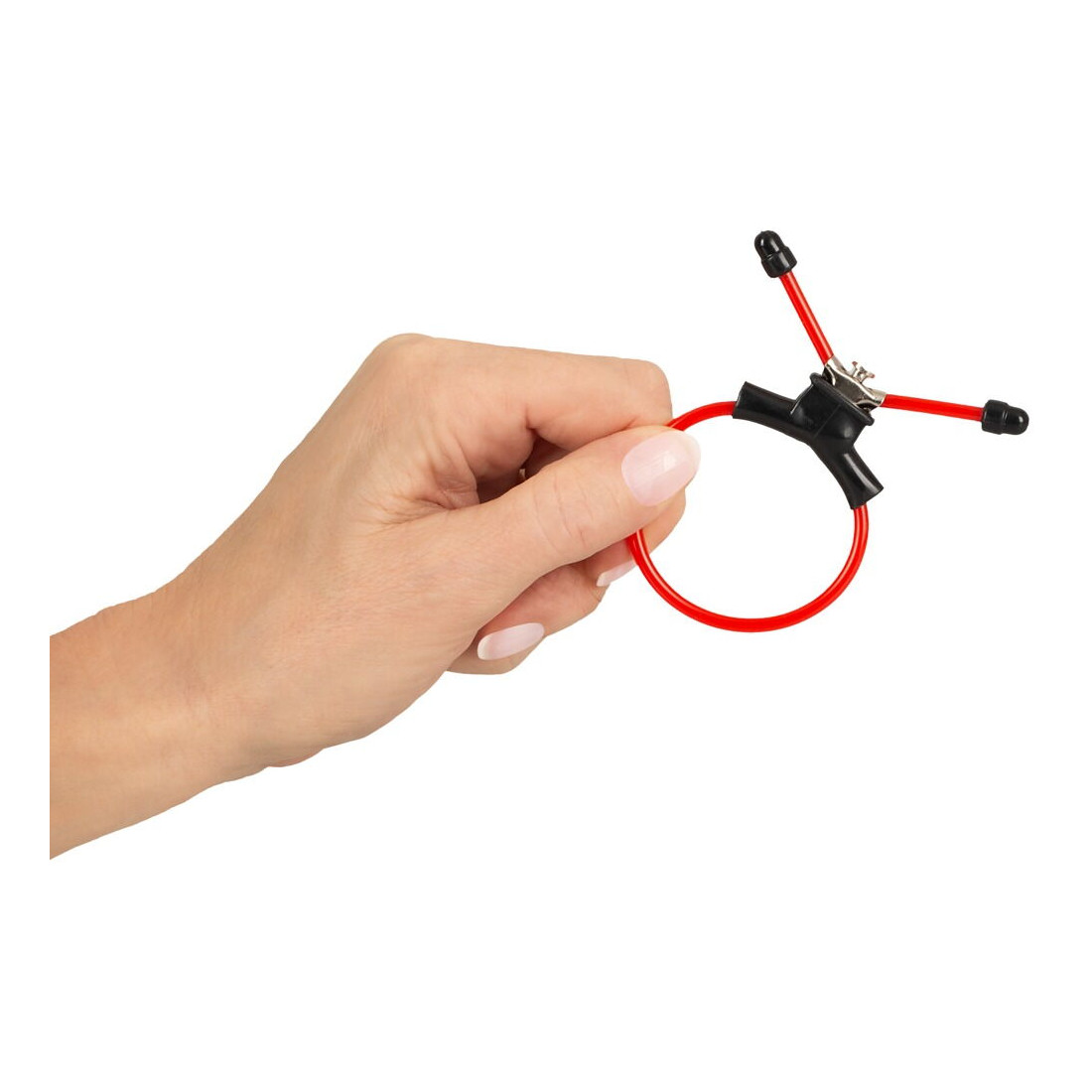 Knaldrød penisring med diskret tryklås, der muliggør justering af størrelsen.
