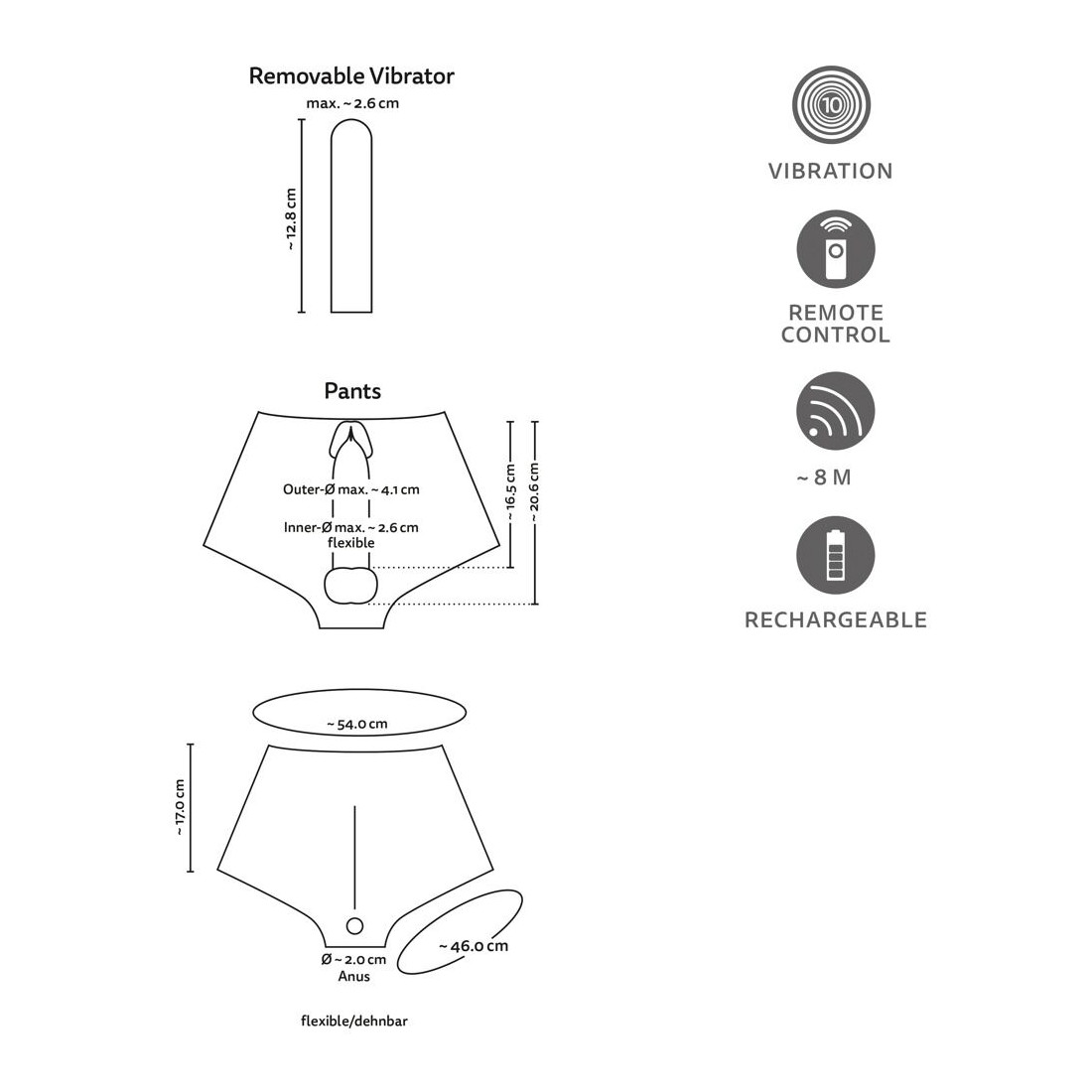I penisdelen finder du en genopladelig vibrator med 10 forskellige vibrationsindstillinger, som kan styres via den medfølgende fjernbetjening med en rækkevidde på op til otte meter. Det giver mulighed for både sololeg og spændende leg med en partner, hvor du kan overlade kontrollen over intensiteten og rytmen. Vibratoren kan også tages ud af penisdelen, så pantsene kan bruges som penisforlængelse – det giver både længde og tykkelse på dit eget lem og åbner op for nye og pirrende positioner.