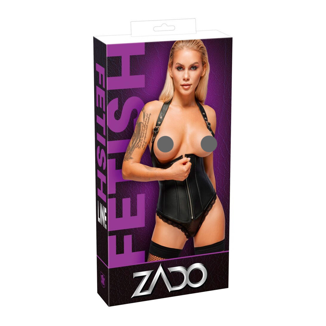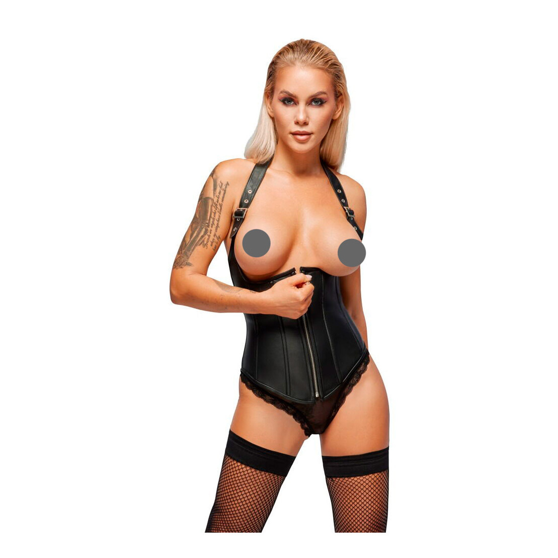 Her får du nemlig en corsage, hvor dine bryster er helt blottede! Kun en bred læderstrop med bæltelukninger holder corsagen oppe. Den går op omkring nakken i et halterneck-look, som er med til at indramme og fremhæve dine bryster på den frækkeste måde!